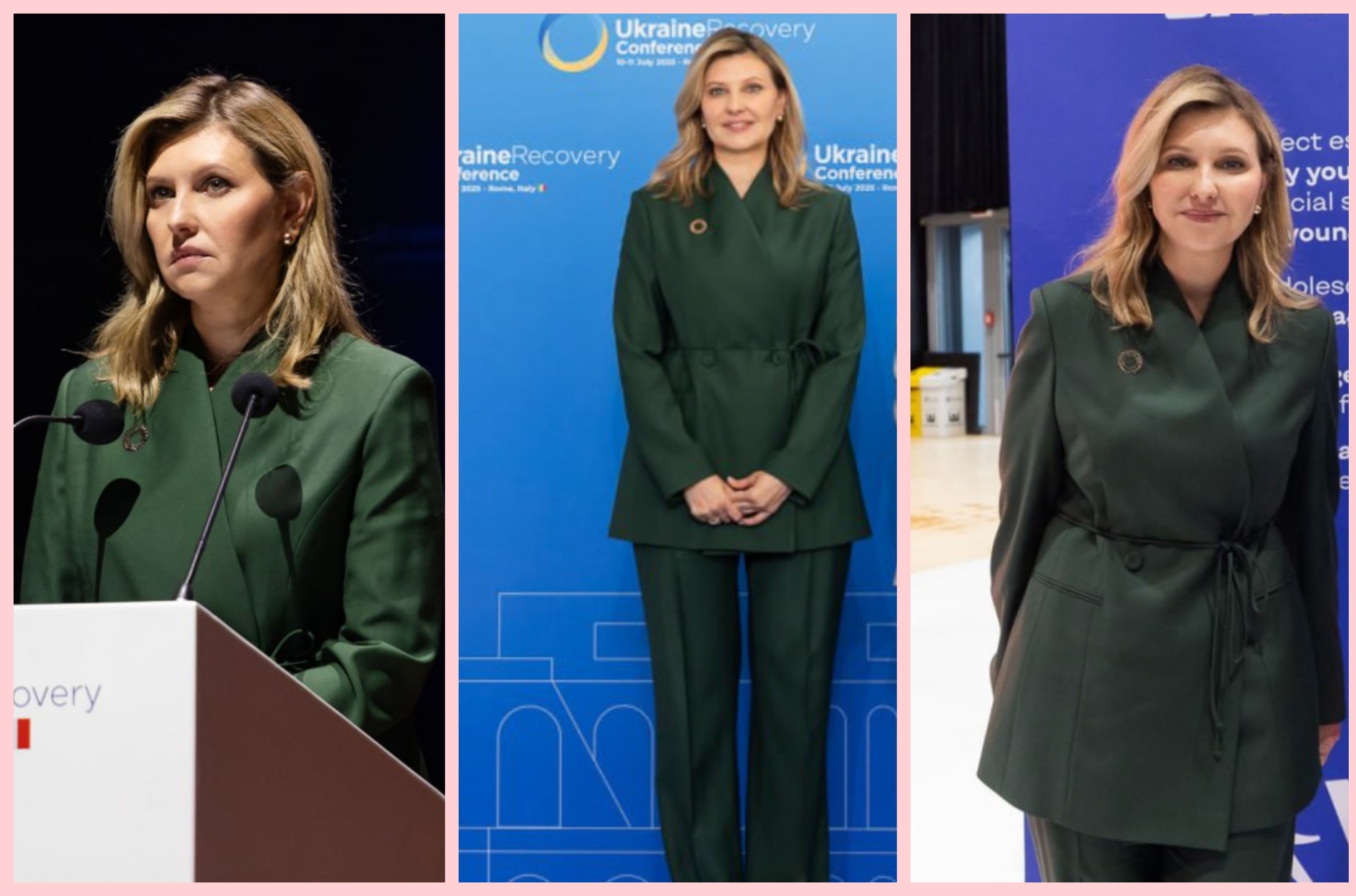 Олена Зеленська не часто обирає яскраві вбрання, тому кожна її поява "в кольорі" стає справжньою подією. Так конференцію у Римі перша леді України відвідала в смарагдовому костюмі вільного крою, який підперезала тоненьким ремінцем.
