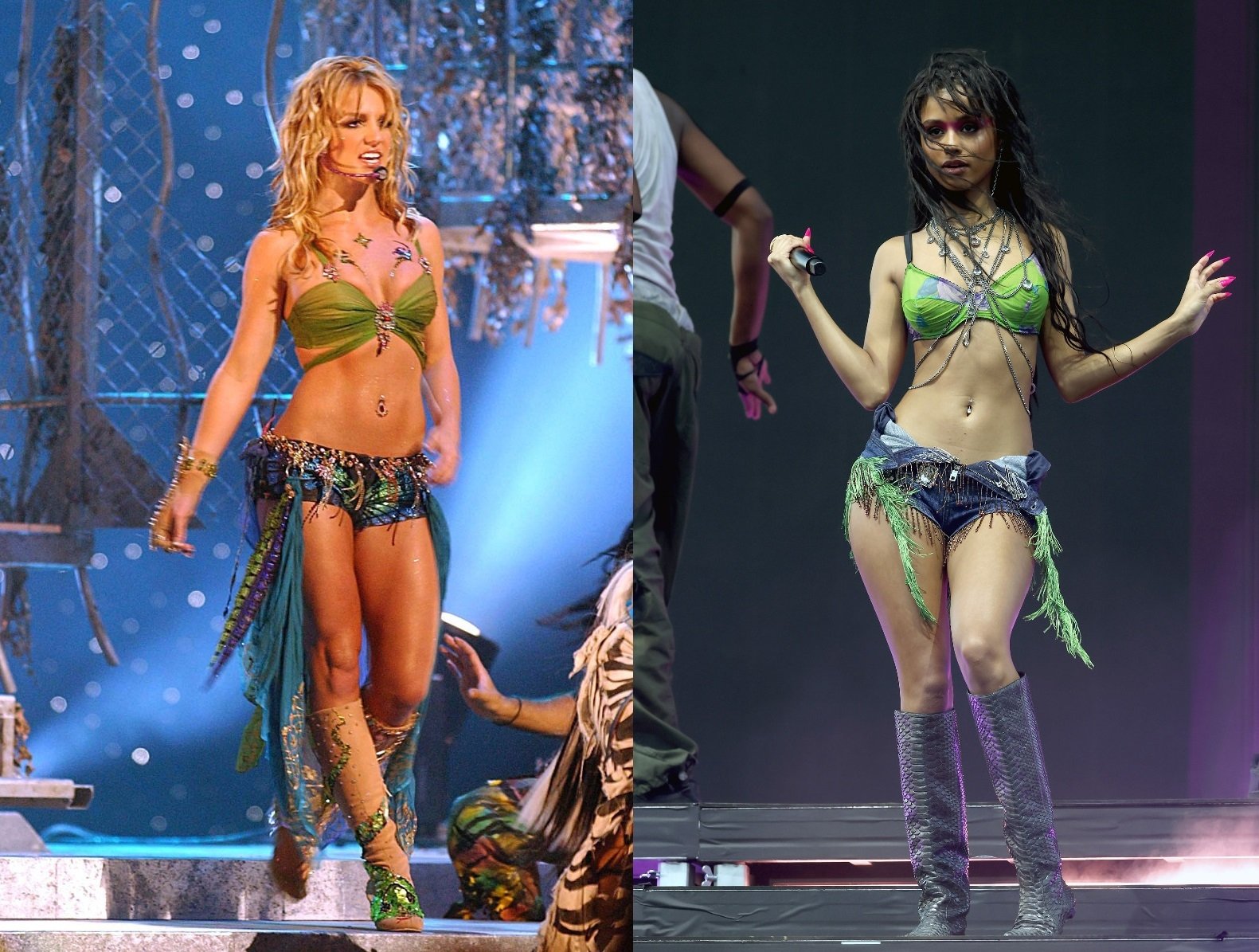 Таке ж вбрання продемонструвала 24 роки тому Брітні Спірс. Так, на сцені MTV Video Music Awards 2001 вона з’явилась у бюстьє зеленого кольору та коротких шортах, декорованих стразами та камінням. На ногах у неї були бежеві чоботи з зеленими елементами.