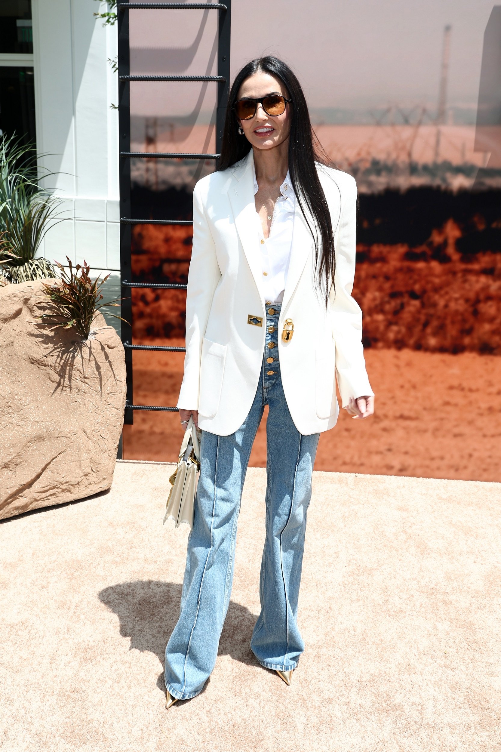Знаменитість позувала фотографам у луці від Schiaparelli. На ній були блакитні джинси-кльош та біла сорочка з золотими ґудзиками. Поверх останньої Демі одягнула стильний блейзер в тон, який прикрашала фурнітура у вигляді замка. Доповнили лук біла сумка з короткою ручкою, окуляри від сонця та прикраси. Волосся Мур традиційно залишила розпущеним, також вона зробила красивий макіяж.