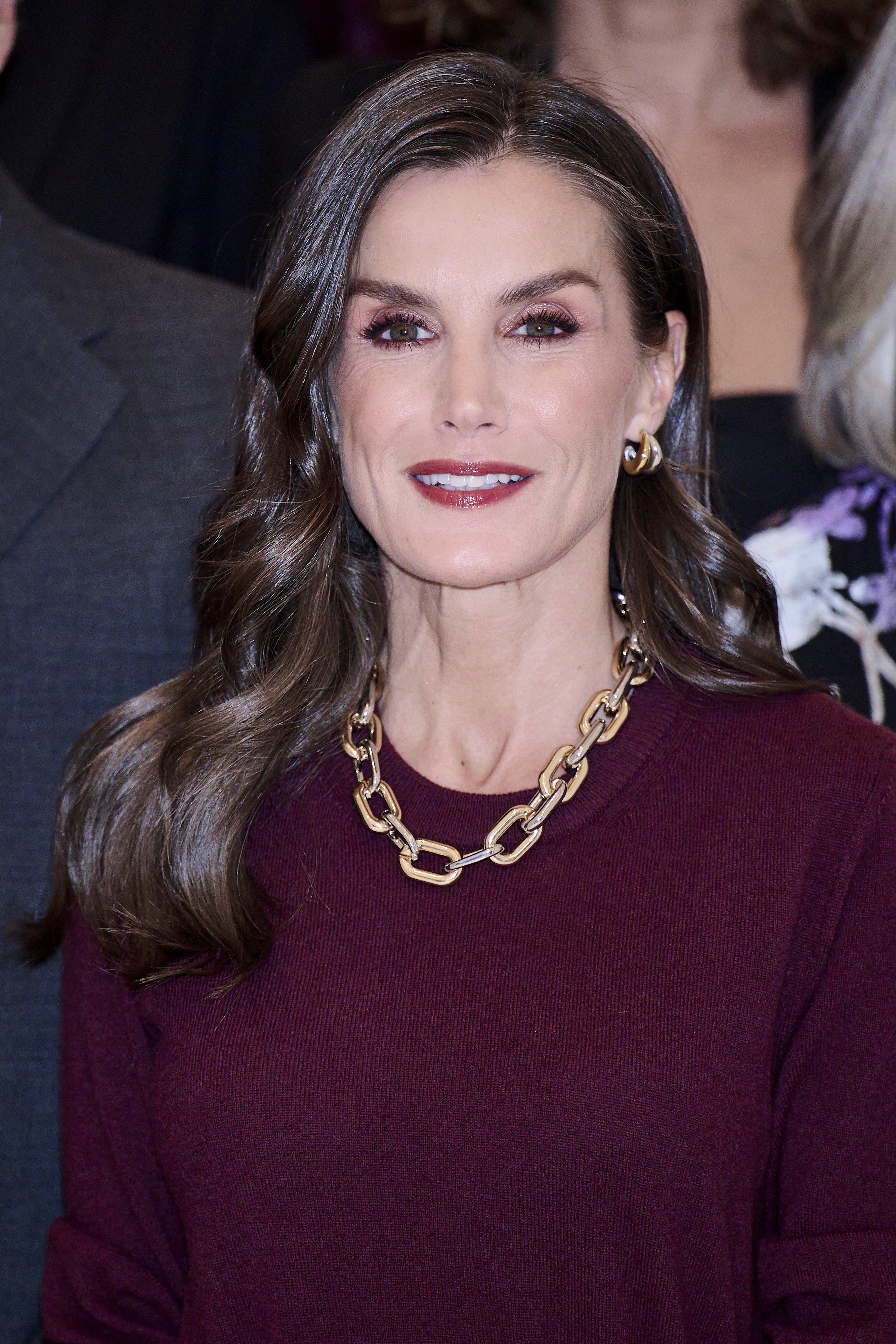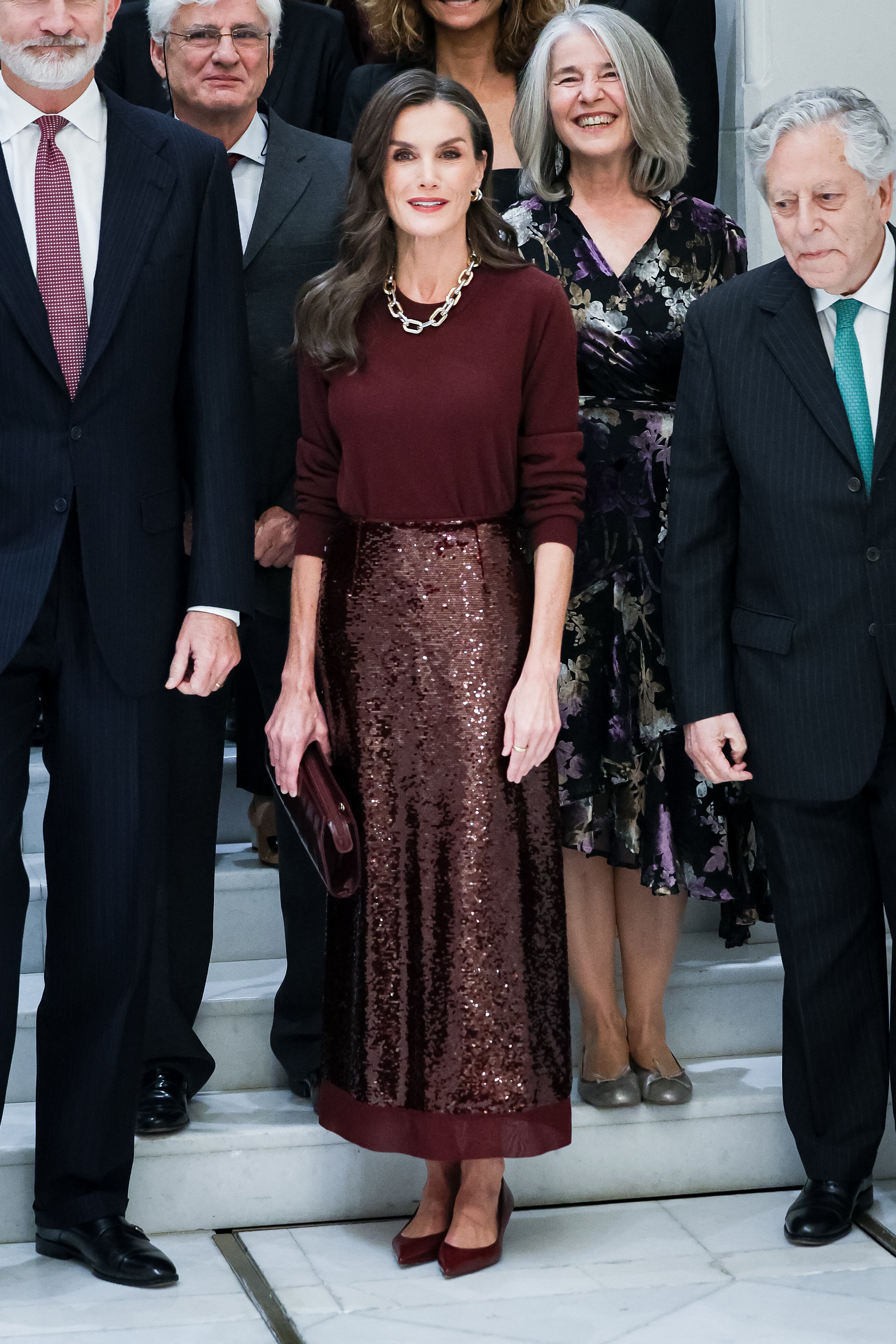 Образ Летиції був складений у насичених темно-вишневих тонах: Летиція одягла лаконічний кашеміровий джемпер, підібравши до нього мідіспідницю з лелітками від одного з улюблених брендів Massimo Dutti. Гостроносі туфлі й місткий клатч прекрасно доповнили лук. З прикрас королева обрала золоті сережки й масивне кольє, які вдало передали святкову естетику образу. В такому вбранні можна відсвяткувати Новий рік як вдома, так і вирушити на вечірку до ресторану, наприклад.