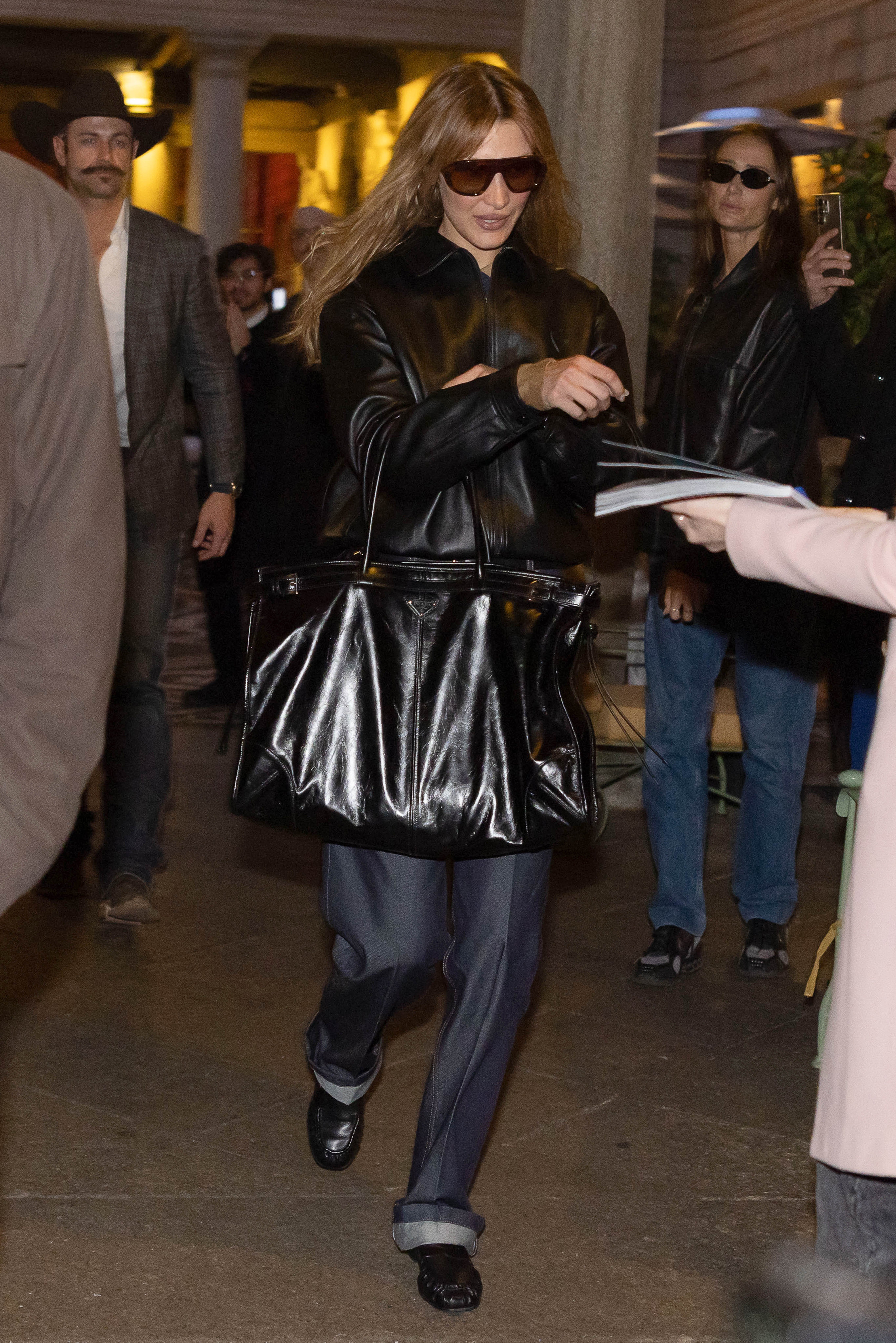 Попри бездоганний брутальний аутфіт — шкіряну куртку, темні джинси та стильні мокасини — головною зіркою образу стала гіпертрофована сумка-тоут. Розміри сумки настільки значні, що вона здається ідеальною супутницею як для довгих прогулянок, так і для робочих поїздок.