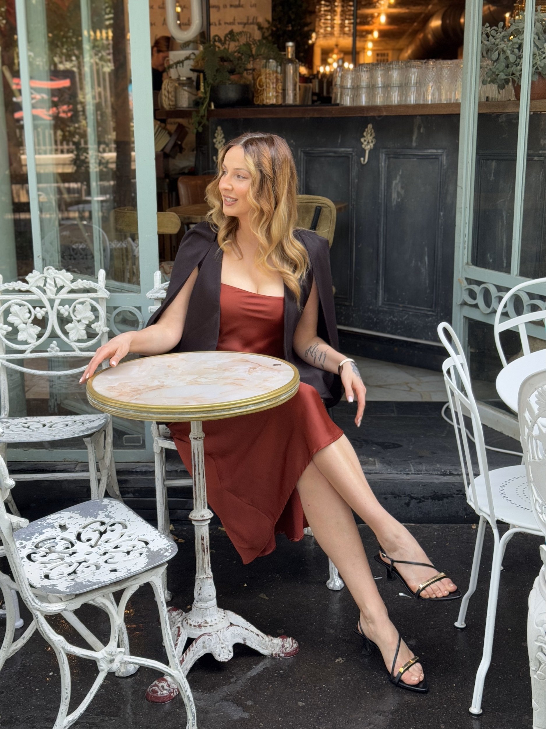 Шовкова сукня та піджак з відкритим рукавом. Делікатність ліній у м’якому денному світлі ресторану.