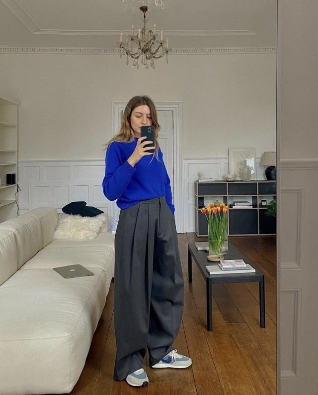 Електрично-синій створює сучасний ритм у луках, особливо в парі з попелясто-сірим — мінімалістично, але ефектно.