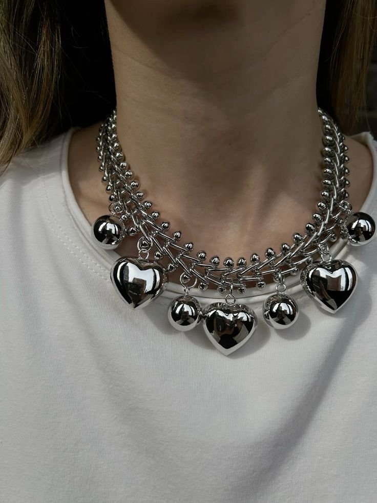 Масивні округлі кольє або щільні ланцюги повторюють форму та візуально роблять верх більш структурованим.