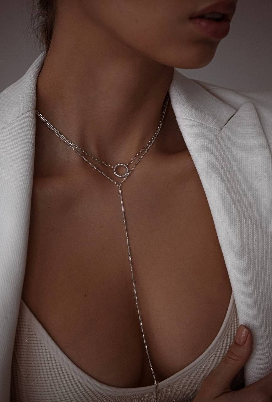 Глибоке декольте найкраще поєднується з довгими ланцюжками, де акцент розташований нижче точки вирізу — це додає образу вишуканої вертикалі.