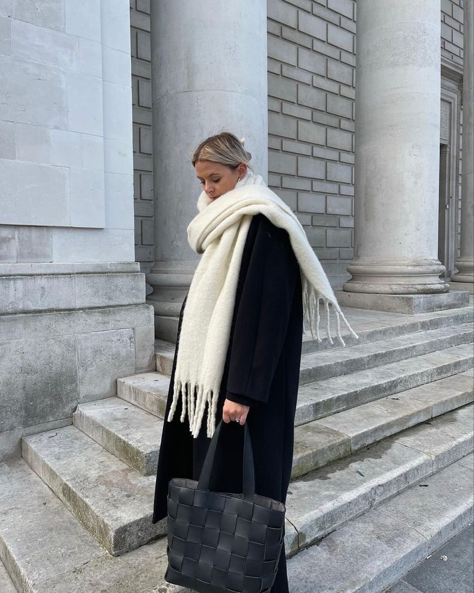 Максимум об’єму, тепла й затишку. Такі шарфи виглядають ніби недбало, але дуже продумано.