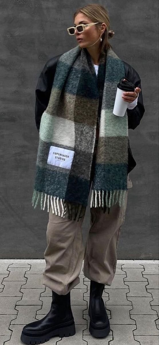 Картатий шарф ідеально особливо вдало працює з монохромними луками у сірій, чорній або бежевій палітрі,