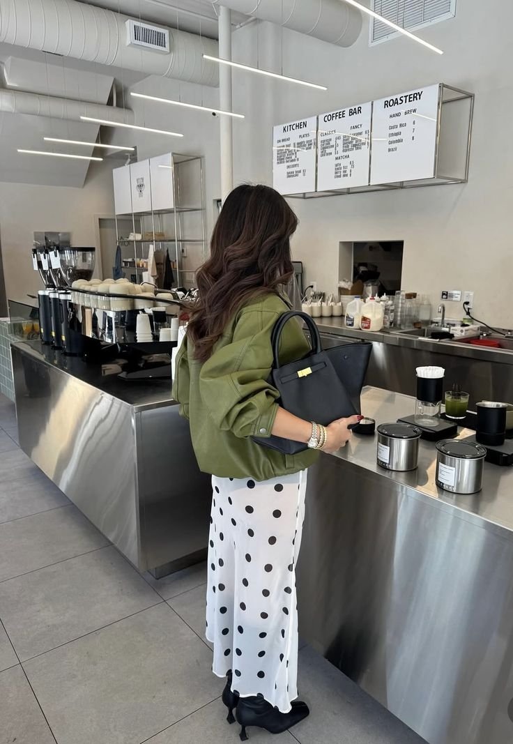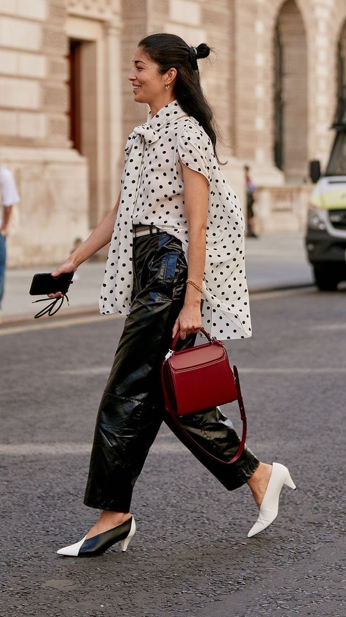 Горошок + шкіра: такий тандем додає образу сучасності та характеру. Це ідеальний баланс між м'якою романтичністю принту та грубою структурою шкіри.