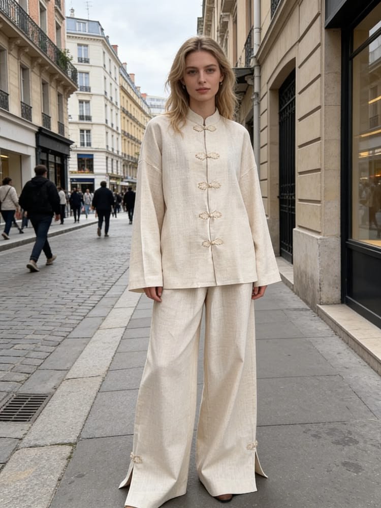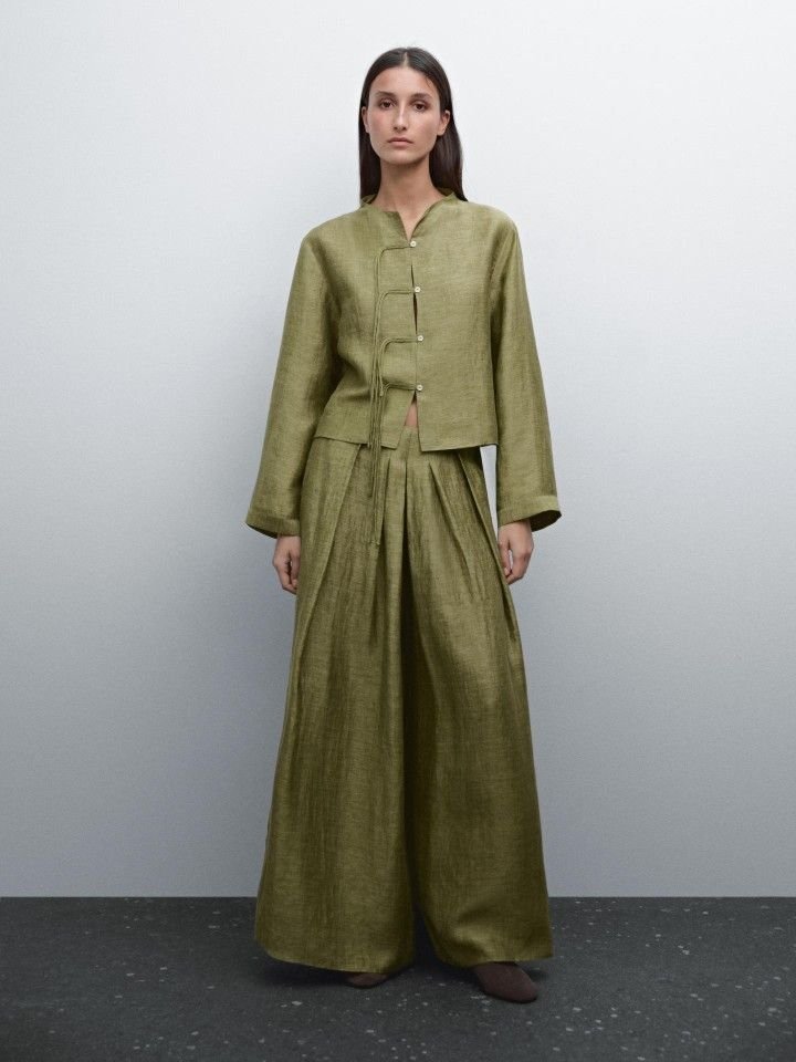 Льон із високою щільністю. Такий льон тримає форму, створюючи архітектурний силует, характерний для японського крою. Він має природну текстуру, яка додає образу глибини без зайвого декору.