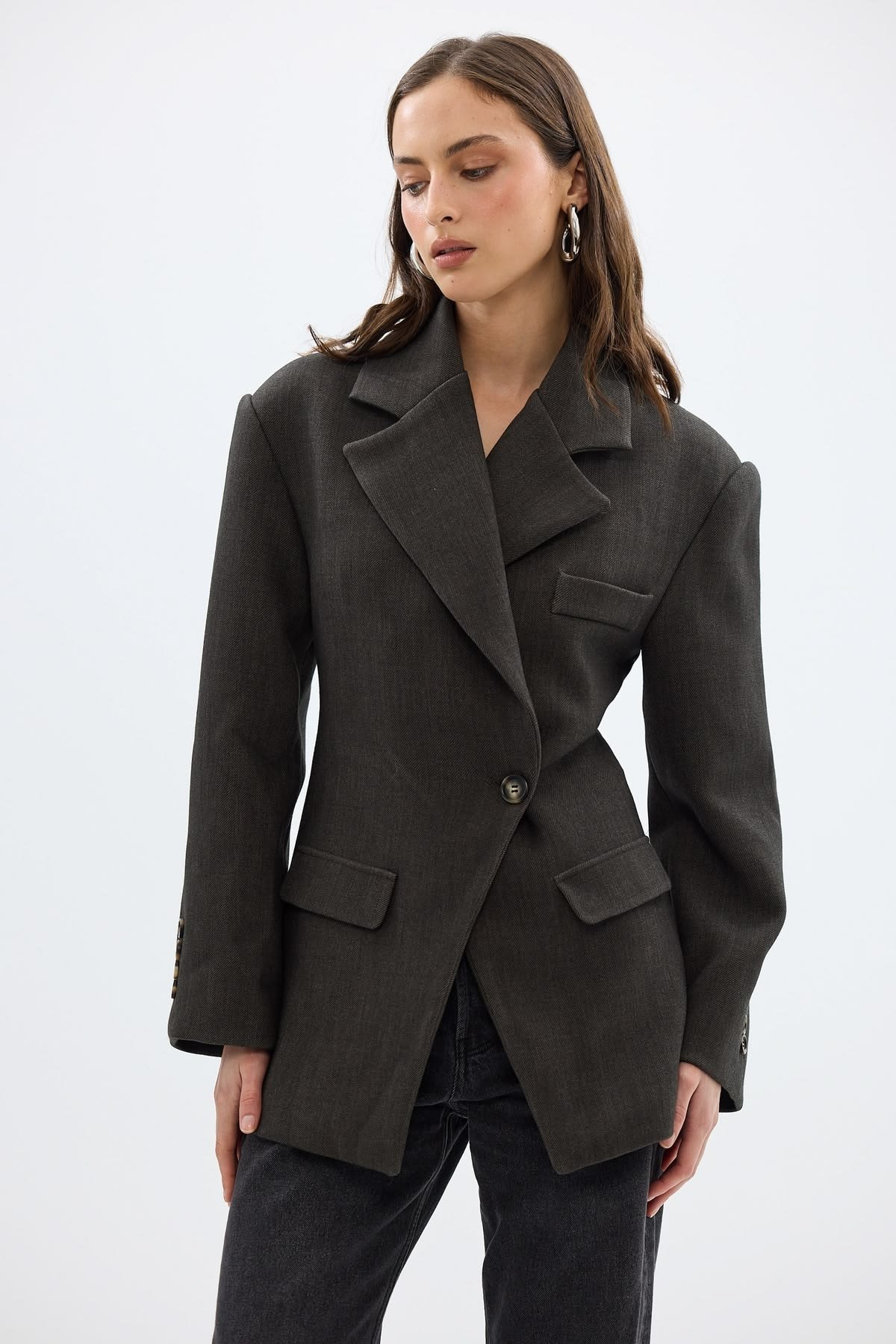 Структурований блейзер із чіткою лінією плечей створює необхідний контраст: на тлі плечового пояса талія автоматично здається набагато вужчою. Моделі з вбудованим поясом або вираженим приталеним кроєм — це готове рішення, яке надає образу архітектурної чіткості.