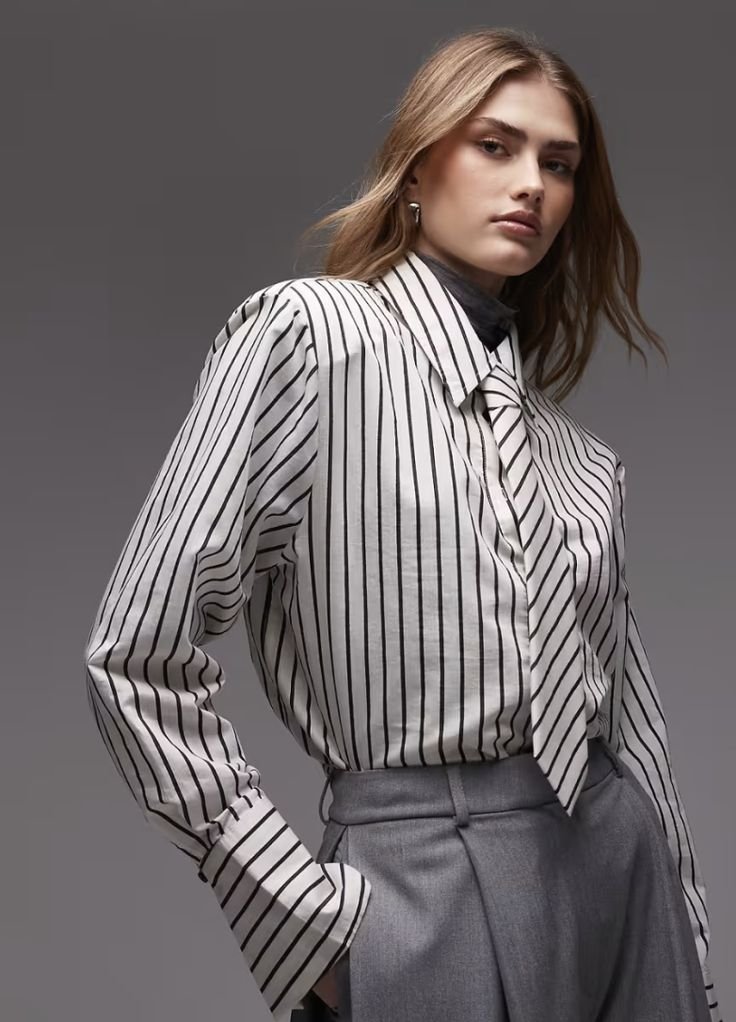 Класичний дует зі штанів і сорочки стане вашим союзником, якщо використовувати вертикаль. Сорочки в смужку або моделі з щільною текстурою візуально витягують зріст. Головне — не залишати сорочку на випуск: підкресліть талію, злегка заправивши край за пояс, щоб зберегти баланс пропорцій.