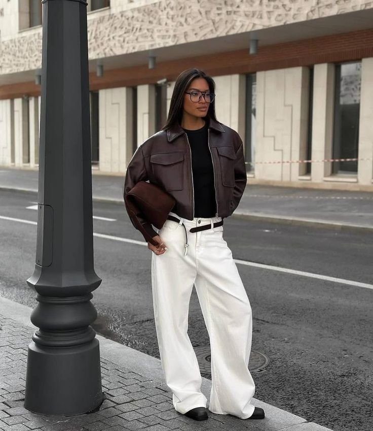 Базові джинси або прямі штани. Темно-сині, чорні чи світлі — вибір залежить від настрою. Головне — зручна посадка та чисті лінії.