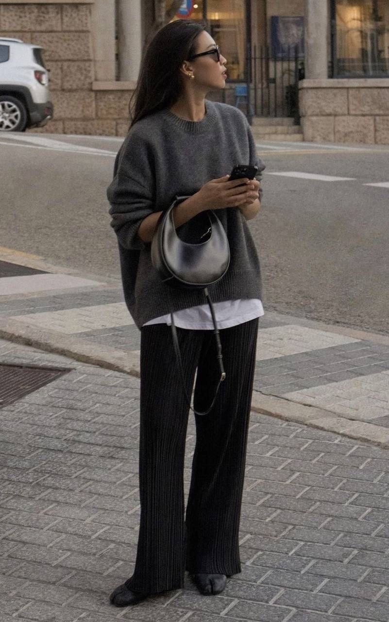 Светр або кардиган середньої щільності. М’який трикотаж додає затишку, а лаконічний фасон зберігає відчуття акуратності.