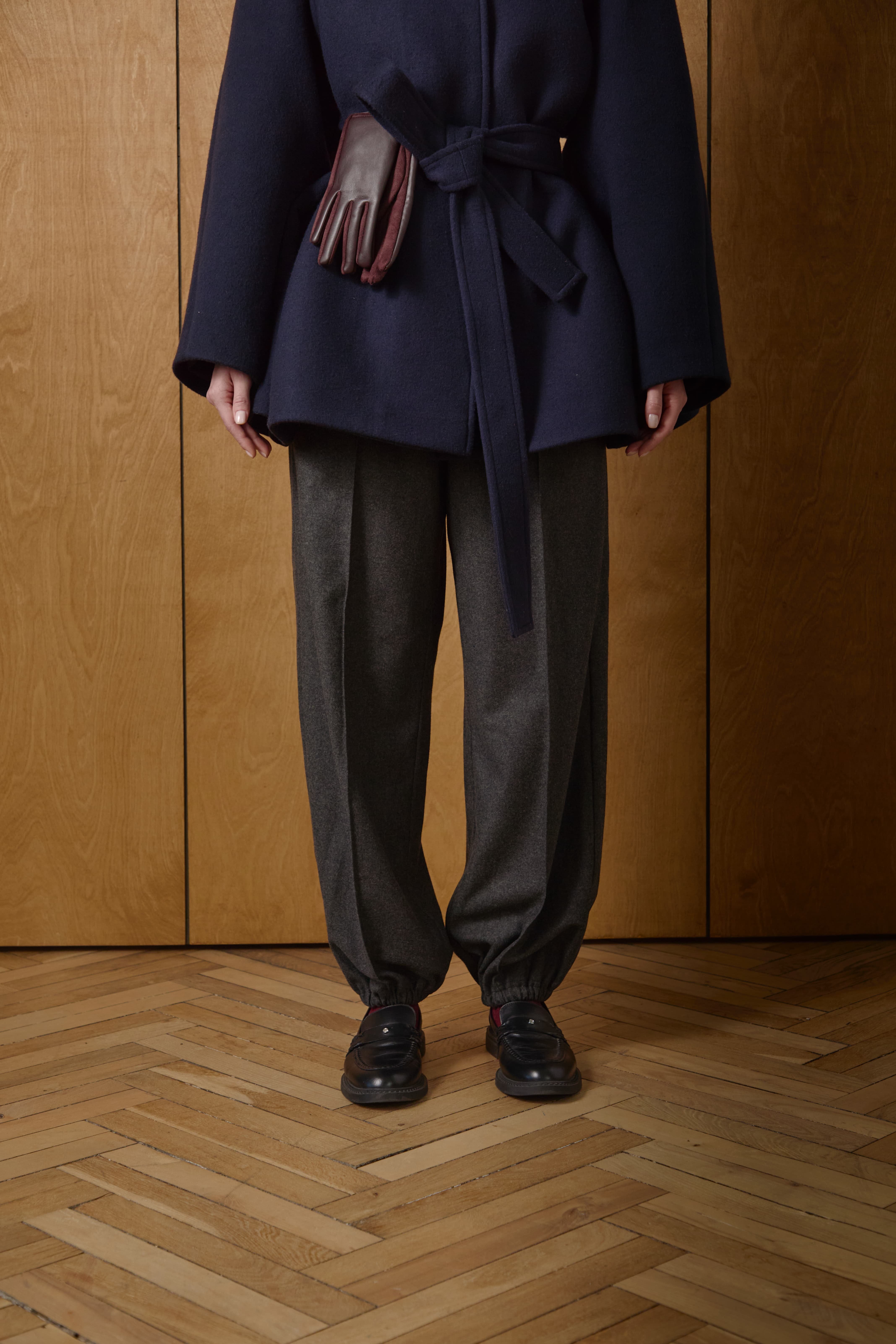 Штани Grey виконані із надмʼякої італійської фланелі з кашеміром, яка приємно огортає тіло. Посадка на зручній резинці робить модель практичною для щоденного ритму без втрати вигляду. Головний акцент — тканина: на перший погляд, лаконічна, але з легким благородним блиском, який додає образу глибини й зібраності. Ці штани легко працюють в образах з трикотажем, жакетами чи верхнім одягом мінімалістичного крою, залишаючись універсальною базою поза трендами.