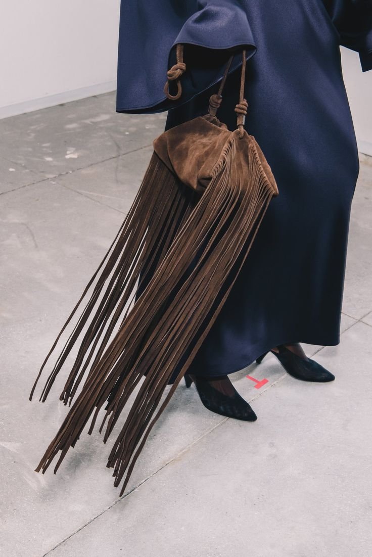 Один із ключових трендів 2026 року. Сьогодні бахрома — не про бохо, а про динаміку, ритм і сучасну жіночність. Вона додає руху й енергії навіть найпростішим формам, роблячи образ легким, грайливим і сучасним. Подовжені нитки шкіри чи замші оживляють аксесуар під час ходи, створюючи відчуття динаміки та ритму. Бахрома перетворює будь-яку сумку на самобутній і емоційний аксесуар, який стає центральним акцентом образу.