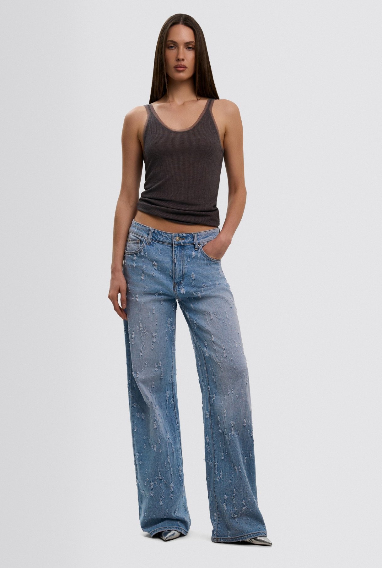 Джинси з вираженою фактурою — потертості, необроблені краї, рвані елементи — додають образу характеру та гранжу. Такі джинси ідеально поєднуються з більш класичними елементами гардероба: базовими футболками, сорочками, тренчами, створюючи баланс між вашим внутрішнім бешкетником та елегантністю.