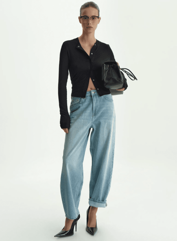 Джинси barrel leg із характерним округлим «О-силуетом» — один із ключових трендів останніх сезонів. Вони додають легкого об’єму в зоні стегон і звужуються донизу, формуючи цікавий силует.
