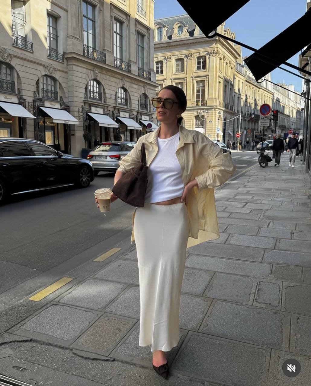 Сорочка у відтінку butter yellow + бежева шовкова спідниця + біла майка