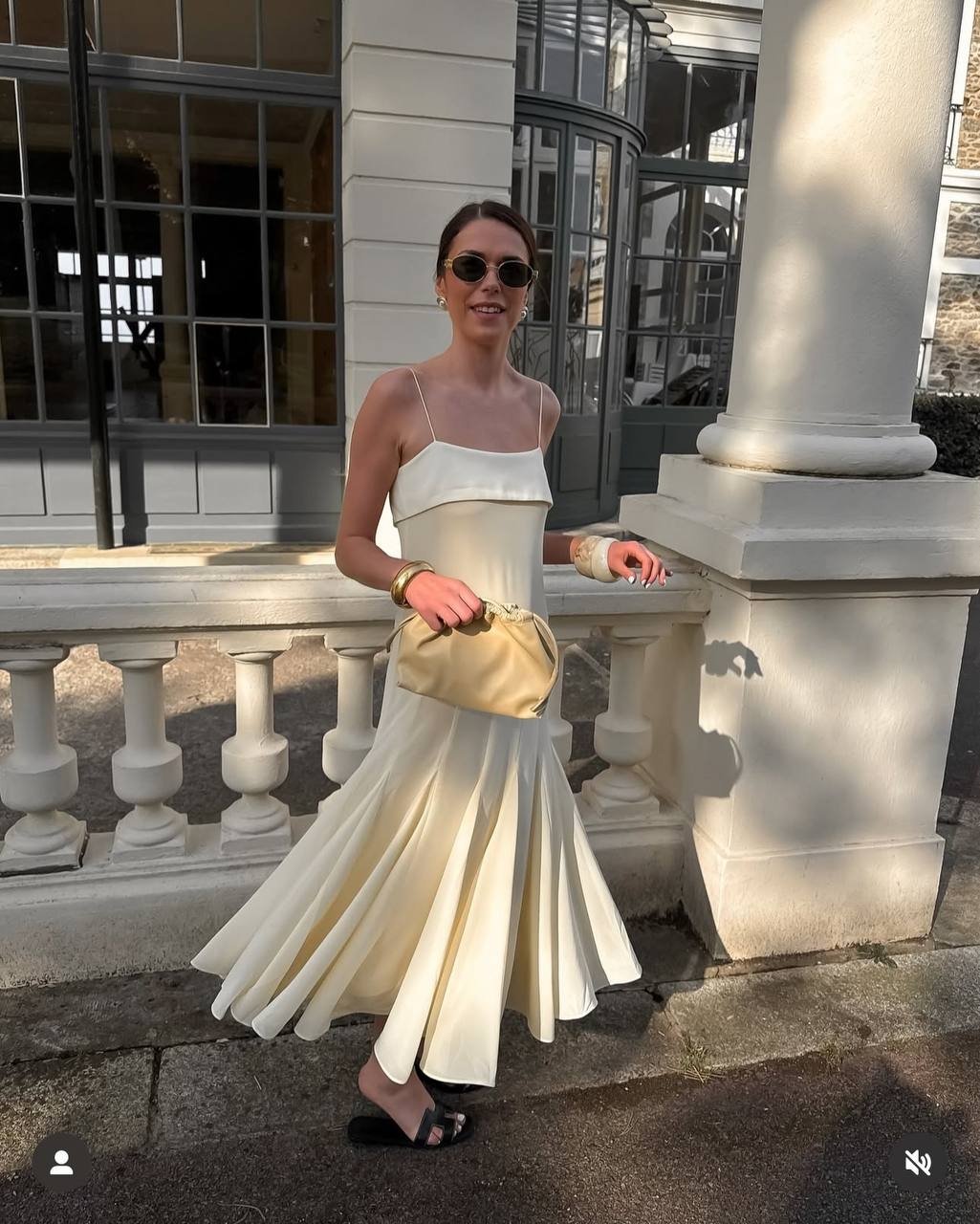 Сукня у відтінку butter yellow на тонких бретелях + масивні золоті прикраси + клатч в тон