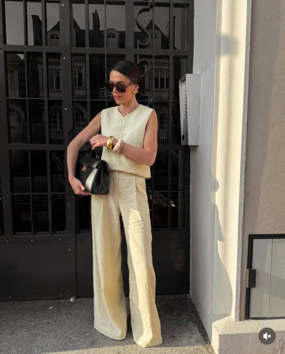 Костюм у відтінку butter yellow з жилетки та широких штанів + чорна сумка
