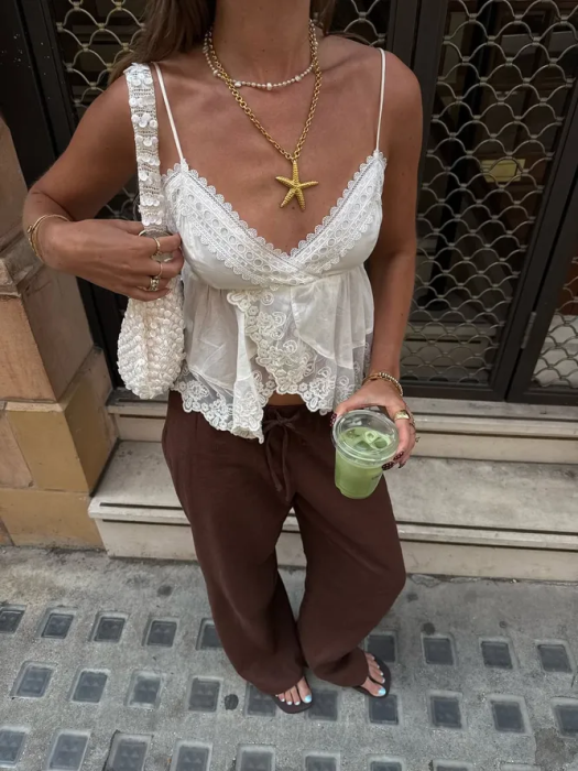 Коли хочеться виглядати просто, але дорого — це комбо для вас. Молочний відтінок м’якший за білий і чудово підходить для літньої спеки. А золото — це завжди святковий акцент. Спробуйте молочну сукню-комбінацію у поєднанні з золотими прикрасами.