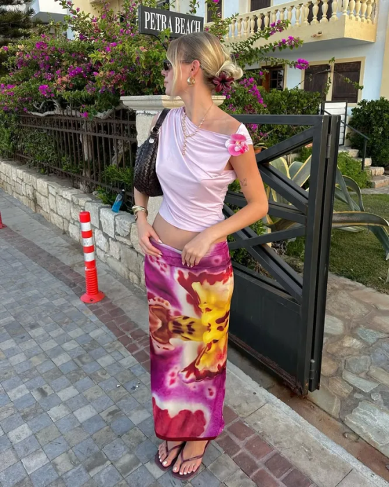 Яскраве, життєрадісне поєднання, яке ніби створене для безтурботного відпочинку. У природі ці кольори часто поруч — тож виглядають гармонійно й на людині. Вдалий варіант: мідіспідниця з квітковим жовто-рожевим принтом і відкритий топ у ніжно-рожевому відтінку.