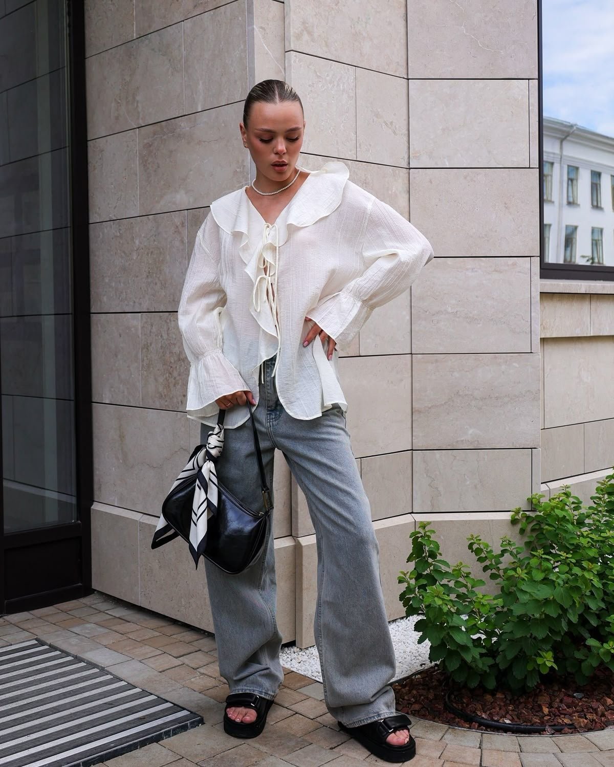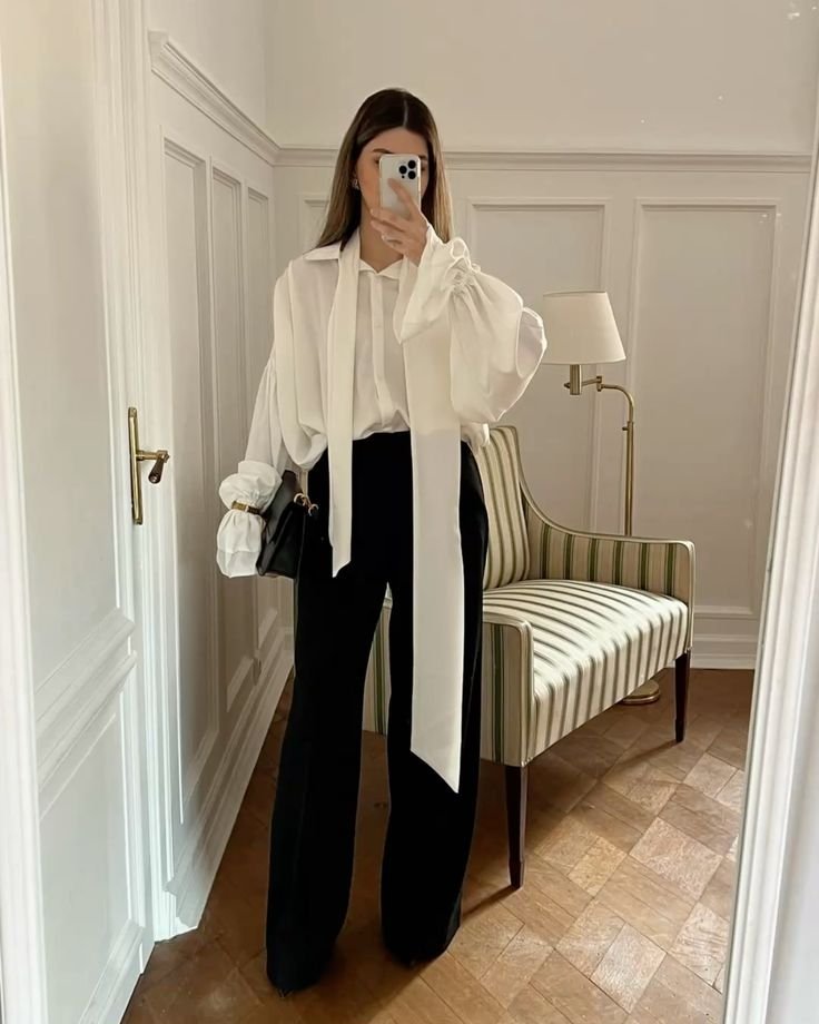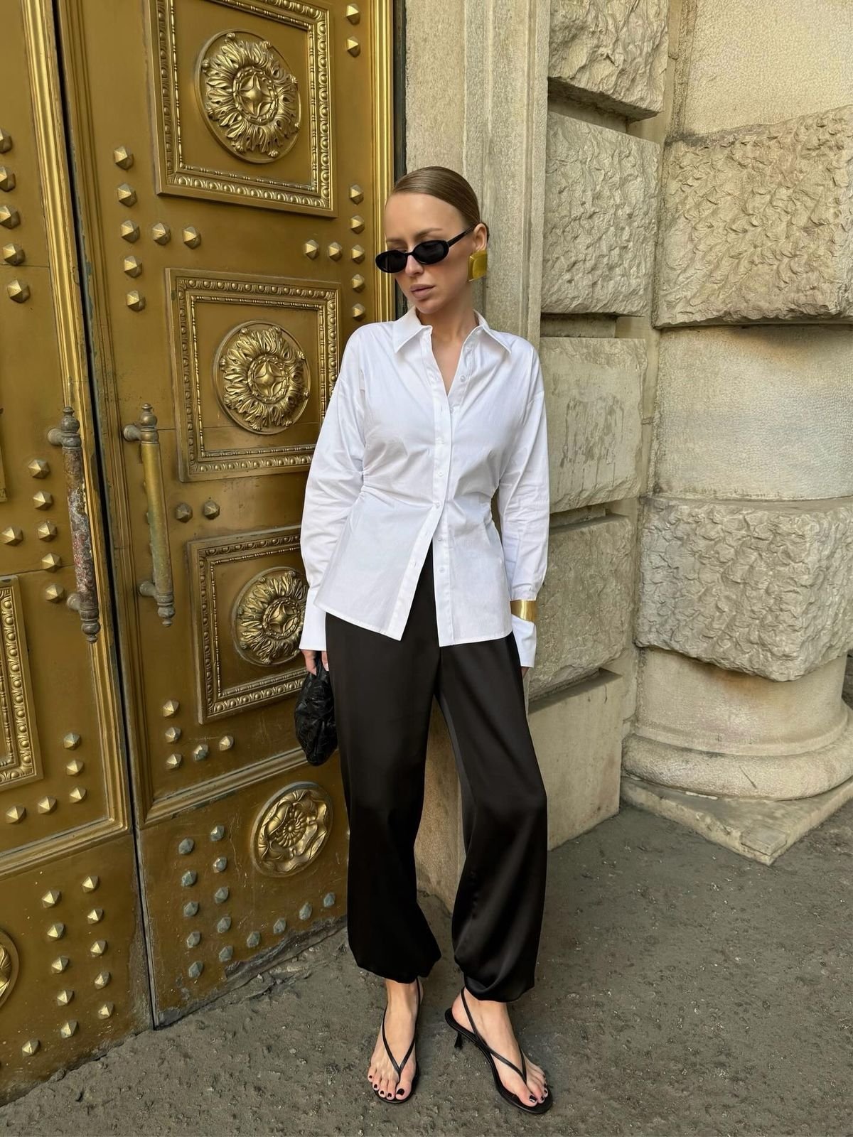 Білу сорочку на 1 вересня можна одягнути майже з усім. Класика жанру — чорні штани й піджак, що створюють стриманий, офіційний вигляд. Зі спідницею — буде жіночніше поєднання, а з джинсами чи широкими штанами — цікавіше. Також білу сорочку можна носити як другий шар — поверх топа.