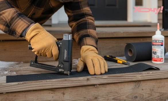 Далі треба почистити сходи від пилу, бруду та снігу та промоктути сухою тканиною від вологи. Тоді клеїмо наждачний папір вологостійким клеєм або ж двостороннім скотчем. На кожну сходинку треба приклеїти по два шматочки і добре закріпити краї.