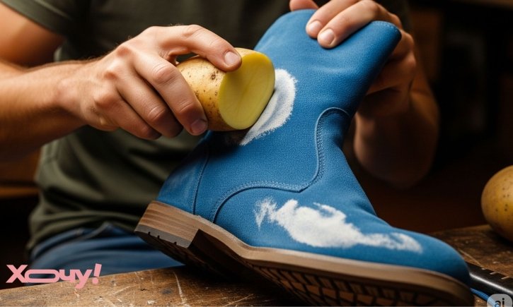 Попередньо потрібно почистити пару від бруду і добре висушити. Найкраще сушити природним шляхом на свіжому повітрі. Далі треба взяти велику сиру картоплину, розрізати її на дві половини і однією добре протирати місця з розводами 2-3 хвилини. Потім сухою щіткою почистити взуття і залишити до повного висихання. Від слідів не залишиться навіть натяку. Це спосіб безпечний, не пошкодить матеріал і не залишить запаху.