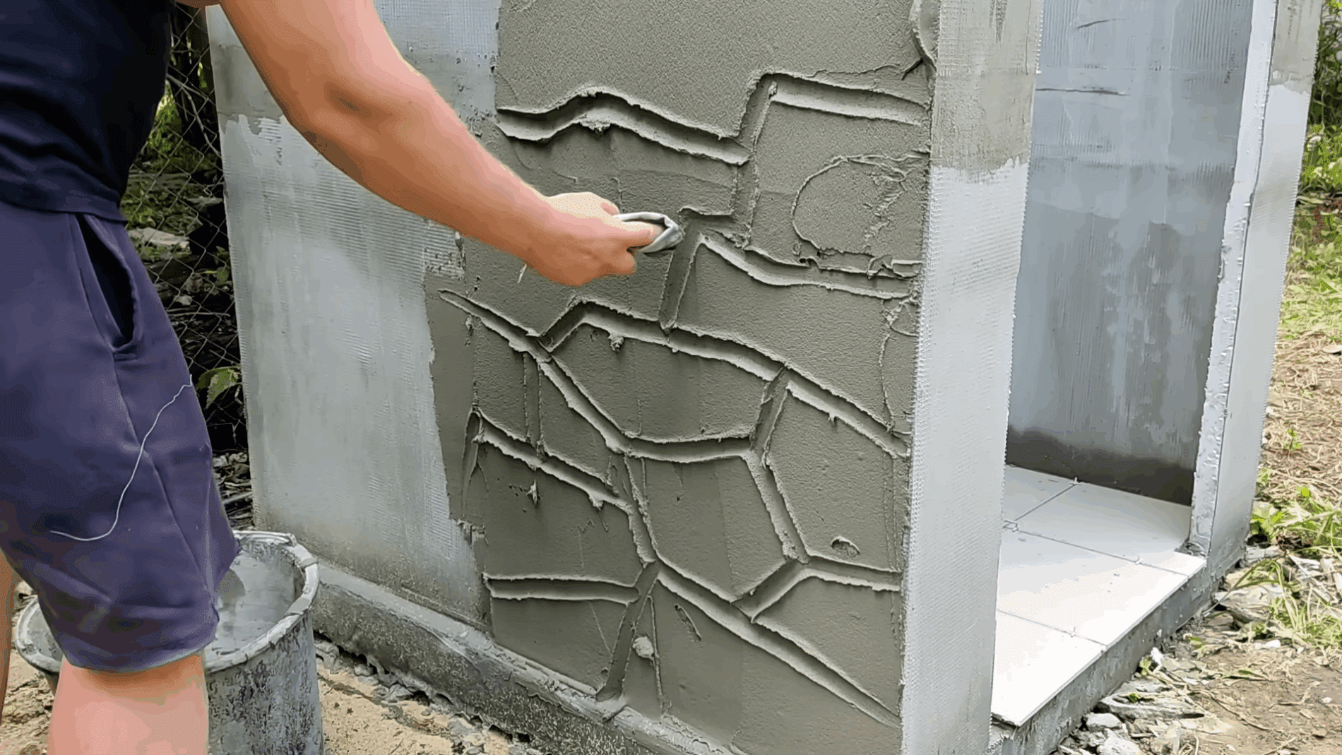 Далі потрібно потинькувати стіни клеєм на цементній основі і заармувати металевою сіткою з накладенням у 10-15 см. Коли штукатурка висохне повністю можна розпочинати декоративне оздоблення.