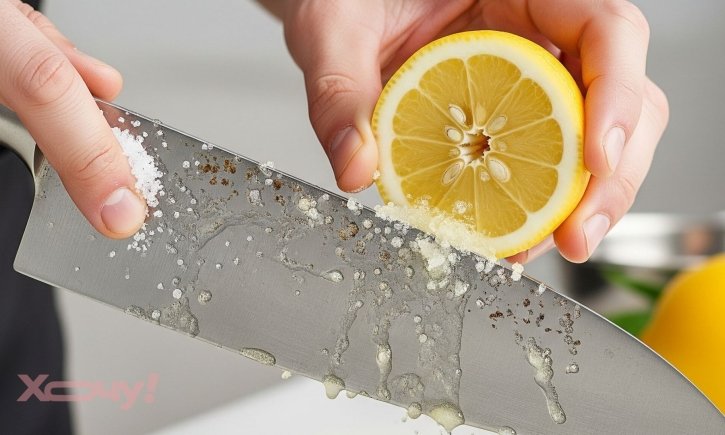 Спосіб особливо ефективний для іржі. Потрібно посипати поверхню ножа сіллю, зверху налити лимонного соку і залишити на 10 хвилин. Далі потерти забруднене місце шкіркою лимона або щіткою, промити на насухо витерти.