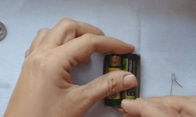 У коробочку складаємо батарейки плюс до мінуса (так, щоб “пиптики” дивились у різні сторони). З одного боку щільно вкладаємо монетку. Вона повинна торкатись обох батарейок. З іншого боку вставляємо діод так, щоб металеві контакти торкались плюса та мінуса. Коли контакти замкнуться, ліхтарик засвітиться.