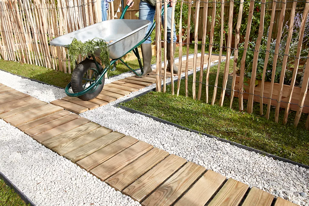 Це має елегантний вигляд і надзвичайно зручно для ходьби. А якщо оточити дерев'яну доріжку шаром чистого білого гравію - це підкреслить чисту та сучасну естетику.