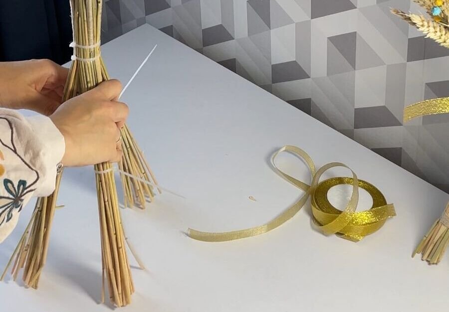 Зберіть колоски у верхній частині снопа в одну акуратну "шапку". Перев'яжіть їх тонкою стрічкою або шпагатом трохи нижче колосся.