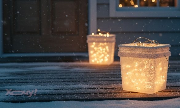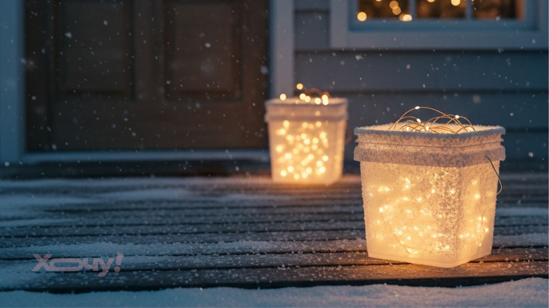 Якщо у вас є відра прямокутної чи квадратної форми з них вийдуть чудові світильники для прикраси під'їзду, ґанку або садових доріжок. Ретельно вимийте та висушіть відро і пофарбуйте відро матовою білою фарбою, щоб приховати оригінальний колір і створити ефект снігу.