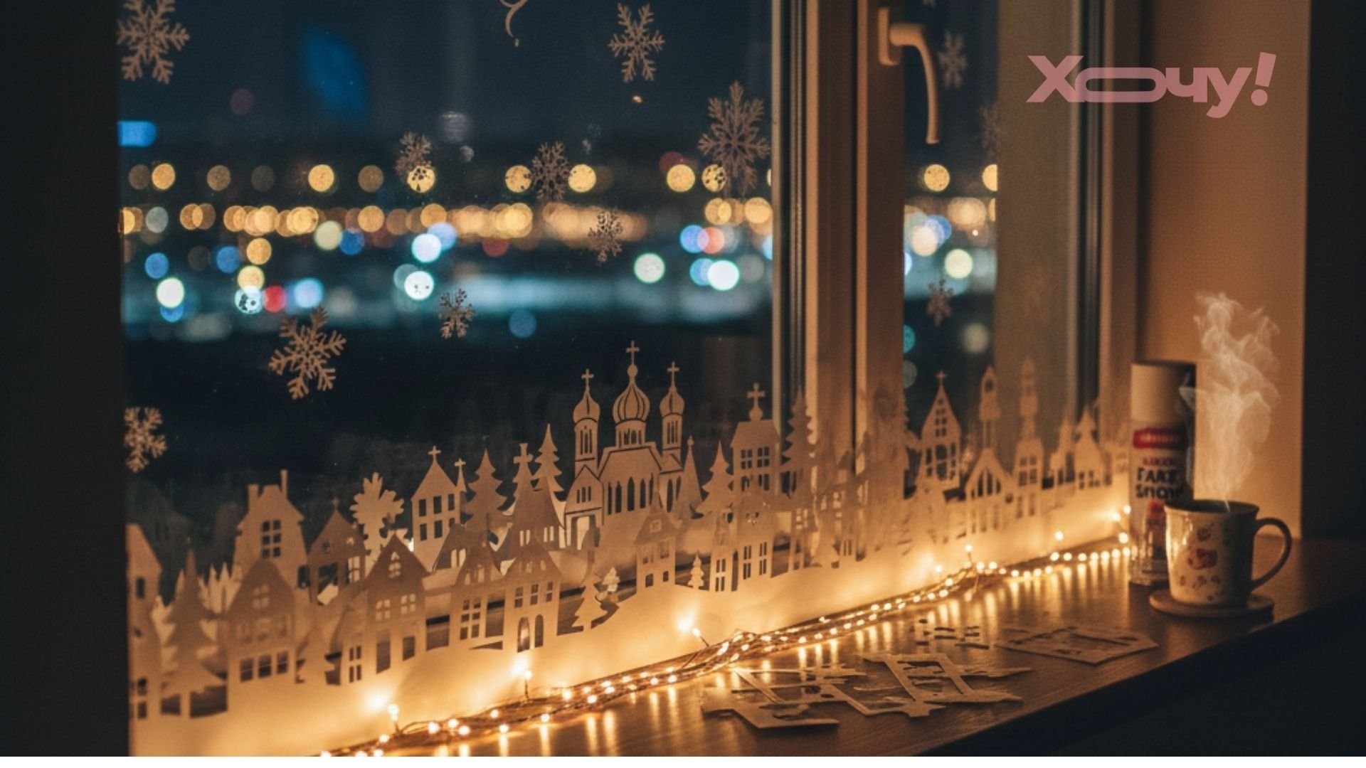 Зубною пастою чи крейдою нанесіть на скло малюнки та візерунки.Витинанки у вигляді засніженого міста на підвіконні, доповнені гірляндою, створять ефект об’ємної декорації, яку буде видно і з вулиці. Навіть звичайні сніжинки зі штучного снігу роблять вікно справжнім порталом у зимову казку.