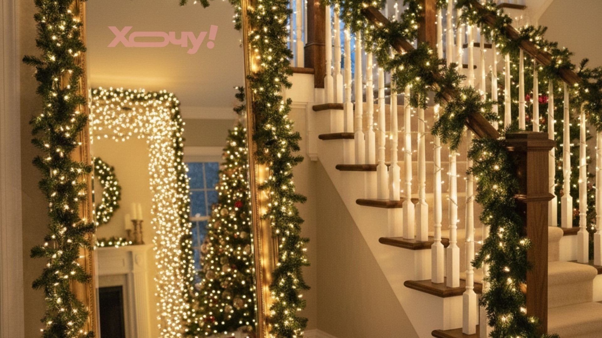 Якщо у вас є дзеркало на повний зріст, обплетіть його хвойною гірляндою (штучною або живою). Це подвоїть кількість вогників у кімнаті завдяки відображенню. Також вогниками можна обплести баляси на сходах.