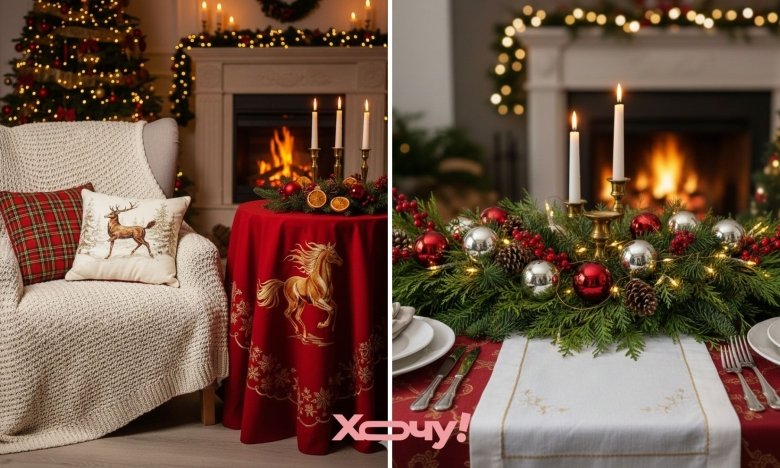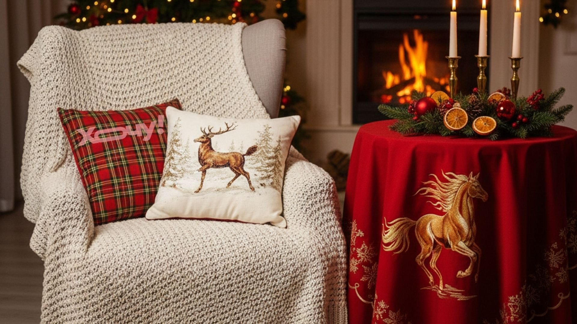 Замініть звичайні наволочки на подушках на тематичні (з оленями, сніжинками або просто червоно-зелену клітинку «тартан»). Додайте м’який плед грубої в’язки на крісло — це миттєво робить кімнату візуально теплішою. На стіл застеліть красиву новорічну скатертину з символом року - Червоним Вогняним конем.