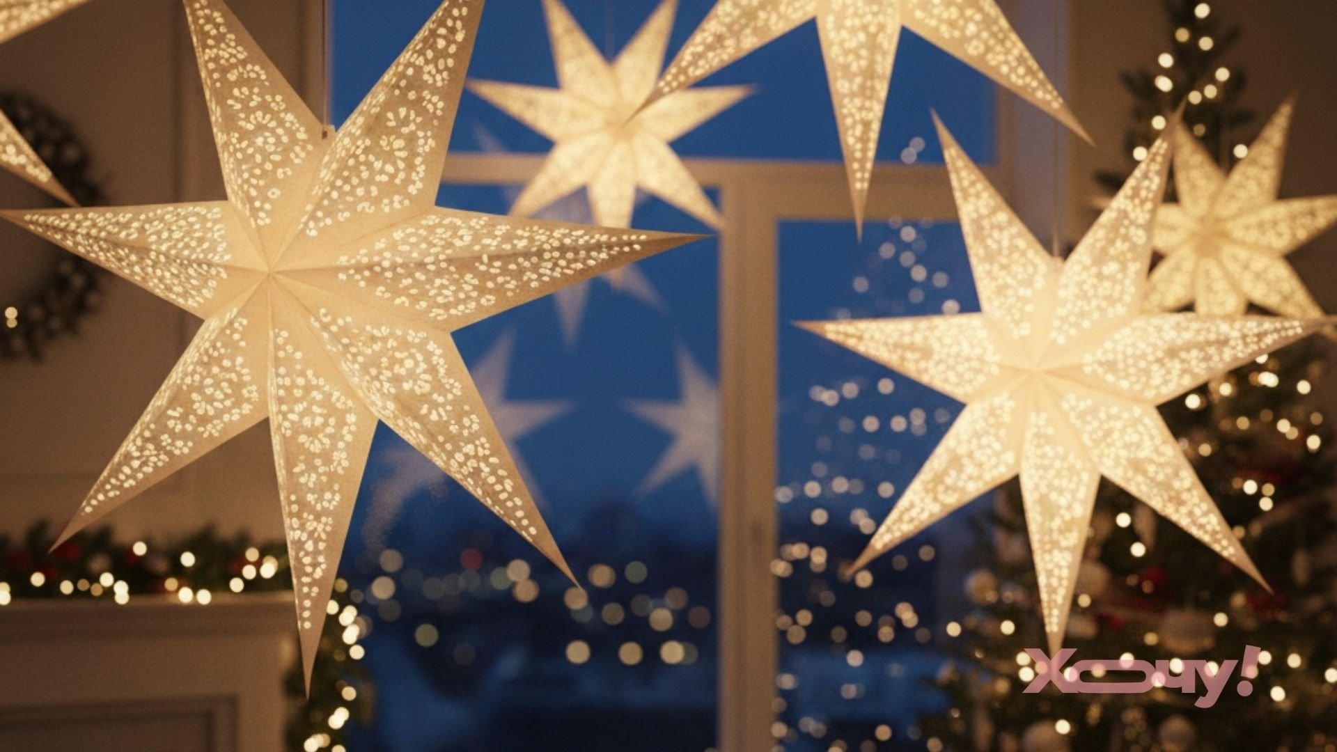 Великі об’ємні зірки, янголи чи банти з крафтового паперу, що світяться зсередини, зараз на піку моди і їх легко зробити власними руками. Підвісьте їх на різних рівнях до стелі або в отворі вікна.
