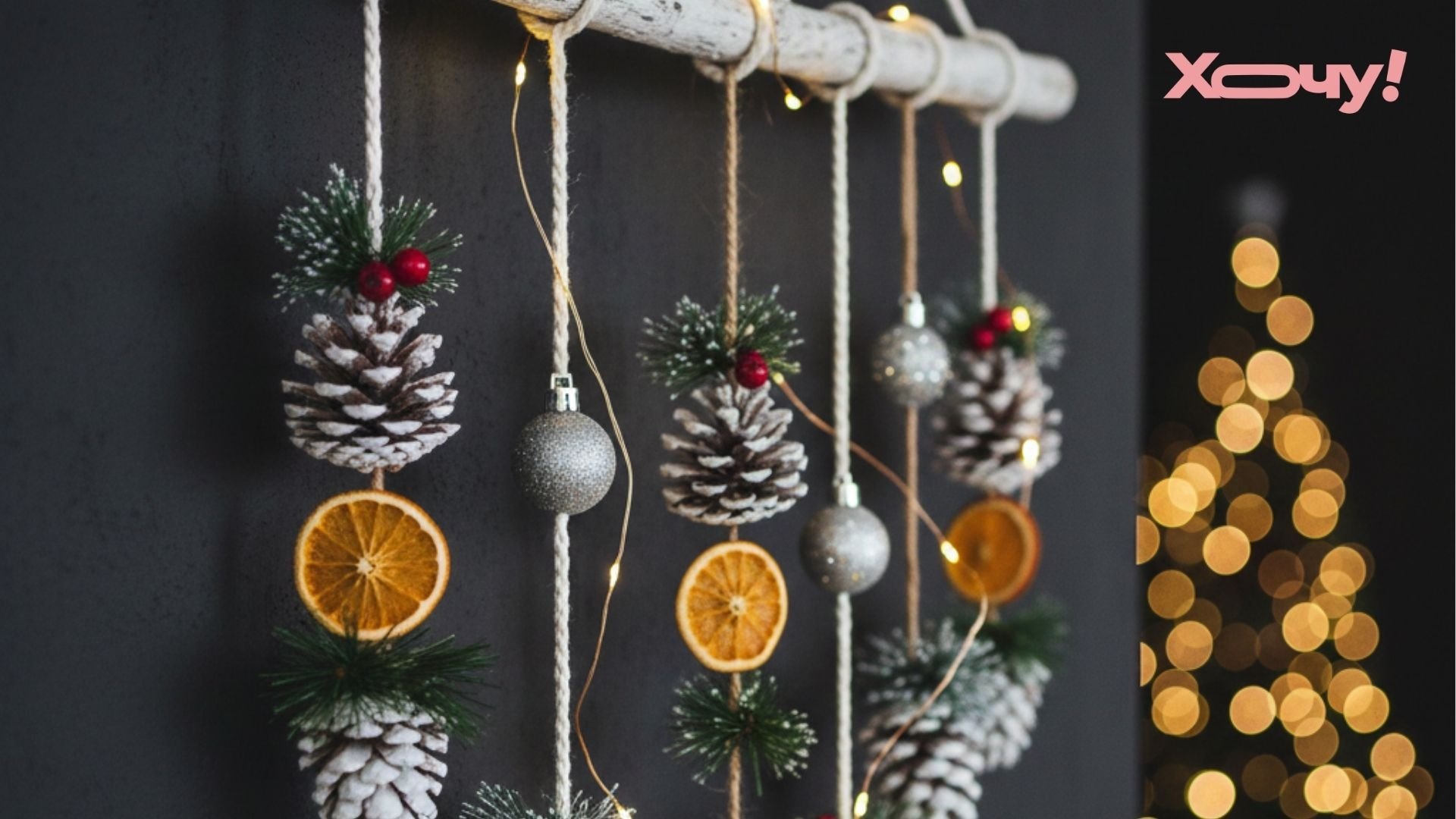 Пофарбувати гілку та шишки у білий колір. Прив’язуємо до гілки красиві мотузки до якої кріпимо шишки та невеликі декоративні деталі – апельсинові скибочки, ялинкові гілочки, блискітки чи штучний сніг.
