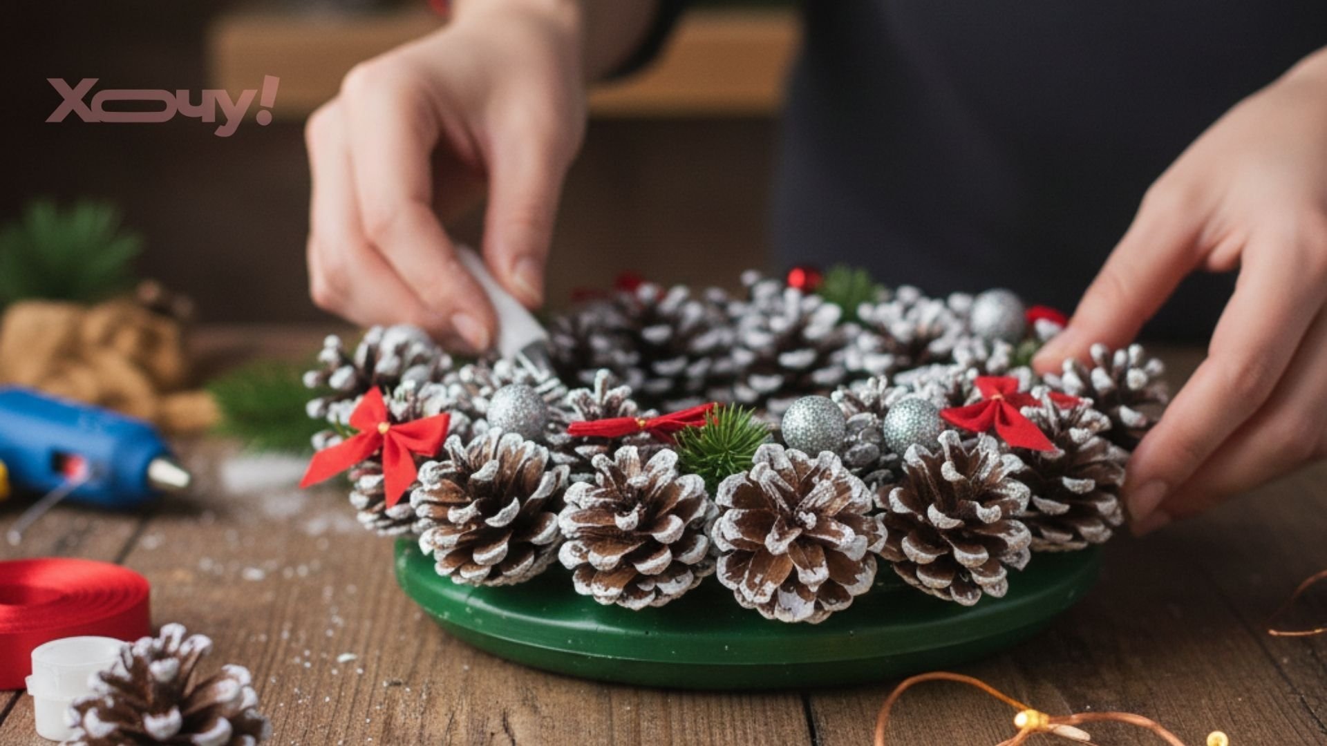 На пластикову основу потрібно обережно наклеїти шишки невеликого розміру. Для фактури нанести білу фарбу. Простір між шишками прикрашаємо маленькими бантиками з атласної стрічки або декоративними елементами.