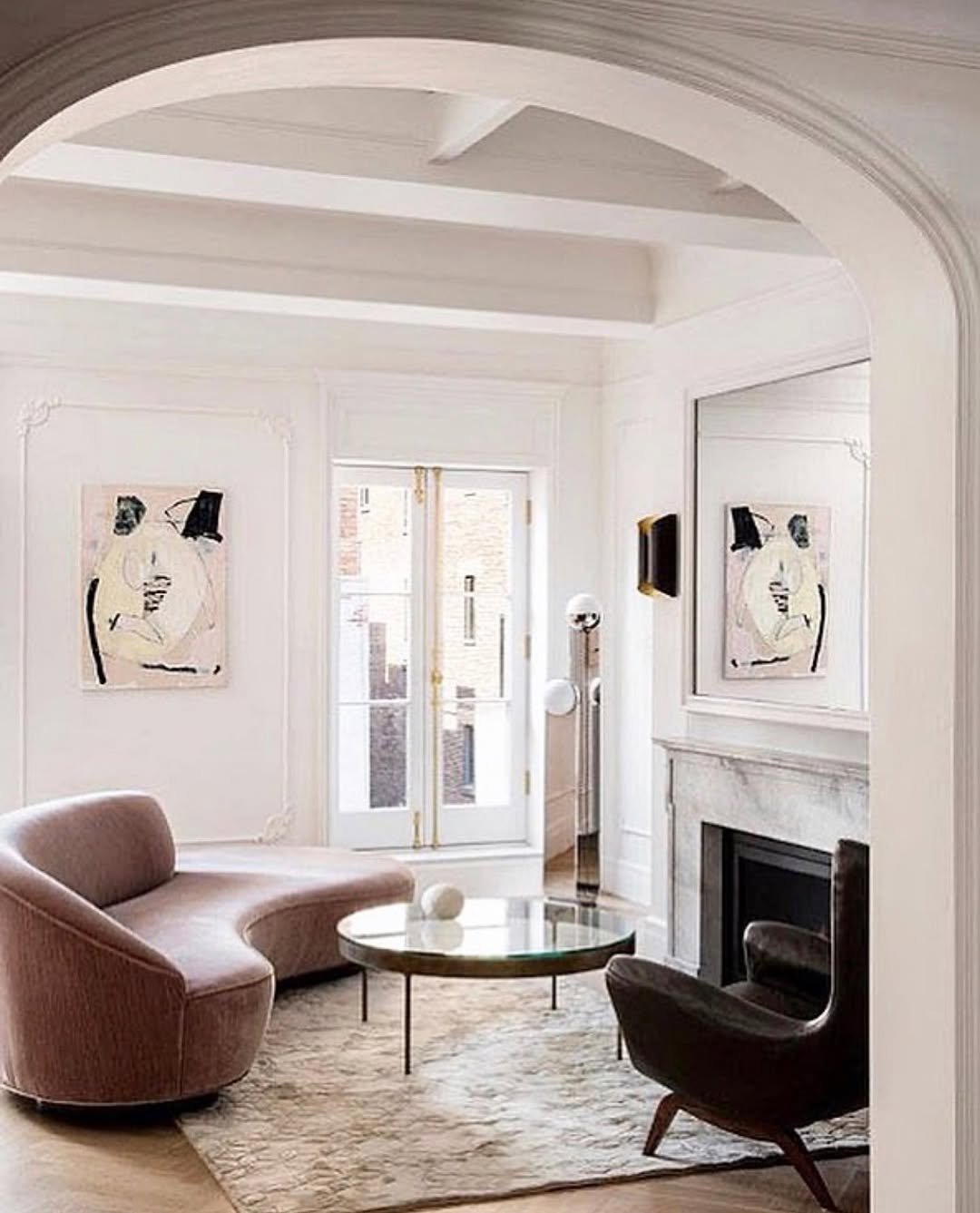 Центр інтер’єру — рожевий диван, який одразу привертає увагу. Це ризикований вибір, але тут він працює, бо не перевантажує простір. Завдяки високим стелям і світлим стінам колір виглядає м’яко, а не агресивно.