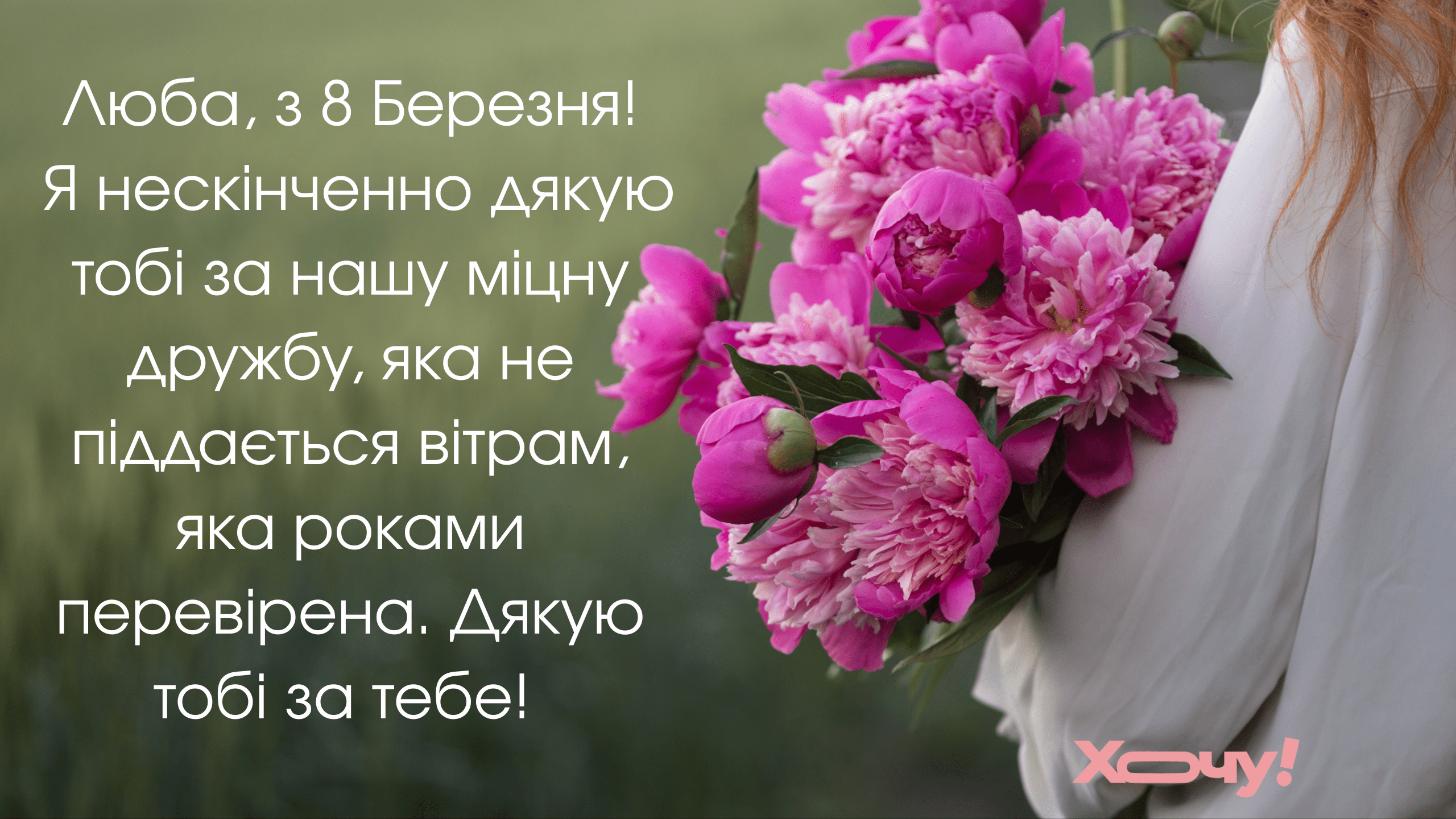 Дорога подружко, вітаю з 8 Березня! Дякую за нашу дружбу, за твою підтримку і за всі веселі моменти, які ми пережили разом. Бажаю тобі всього найкращого! Ти — крута!