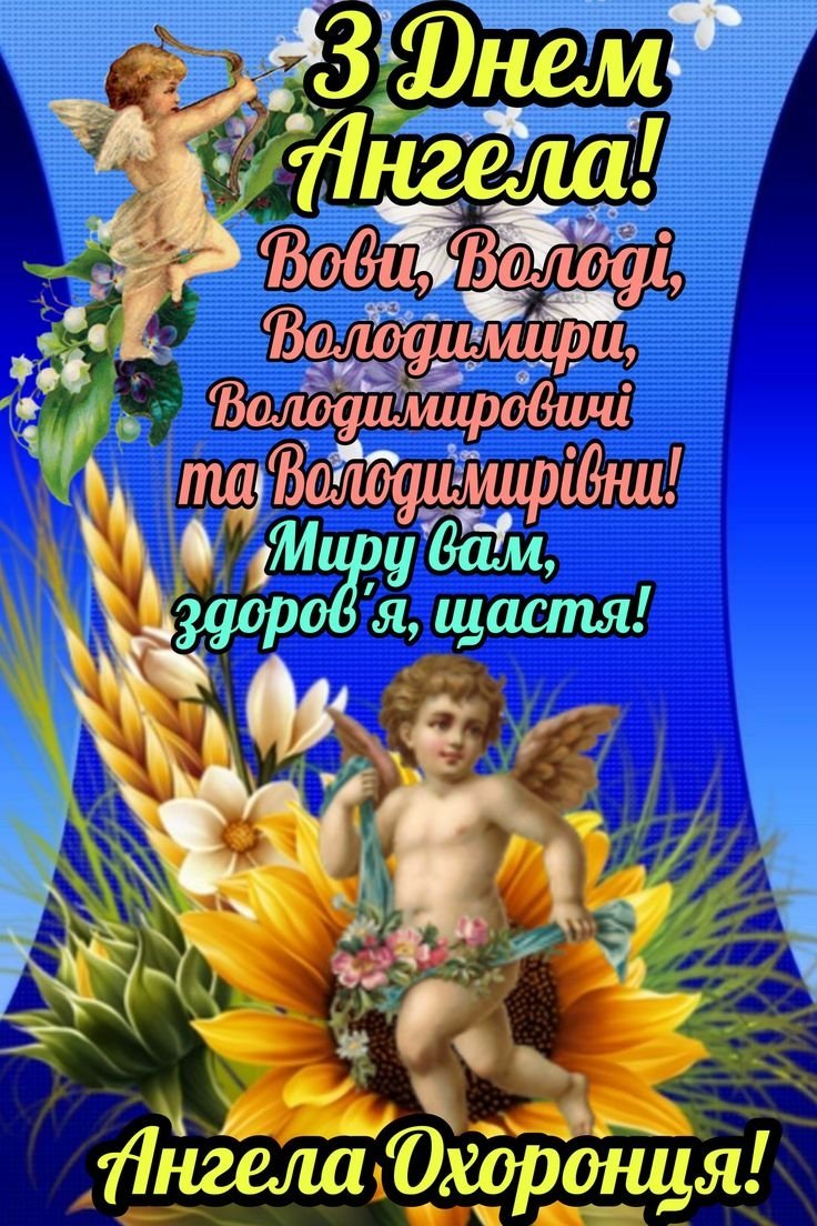 Дорогий Володимире! Від щирого серця вітаємо тебе з Днем ангела! Нехай твій небесний покровитель завжди оберігає тебе від усіх негараздів, дарує міцне здоров'я, невичерпну енергію та натхнення для нових звершень. Бажаємо, щоб кожен день був сповнений радості, любові та щастя, а всі мрії обов'язково збувалися. Нехай у твоєму домі завжди панують мир, затишок і злагода! Зі святом!