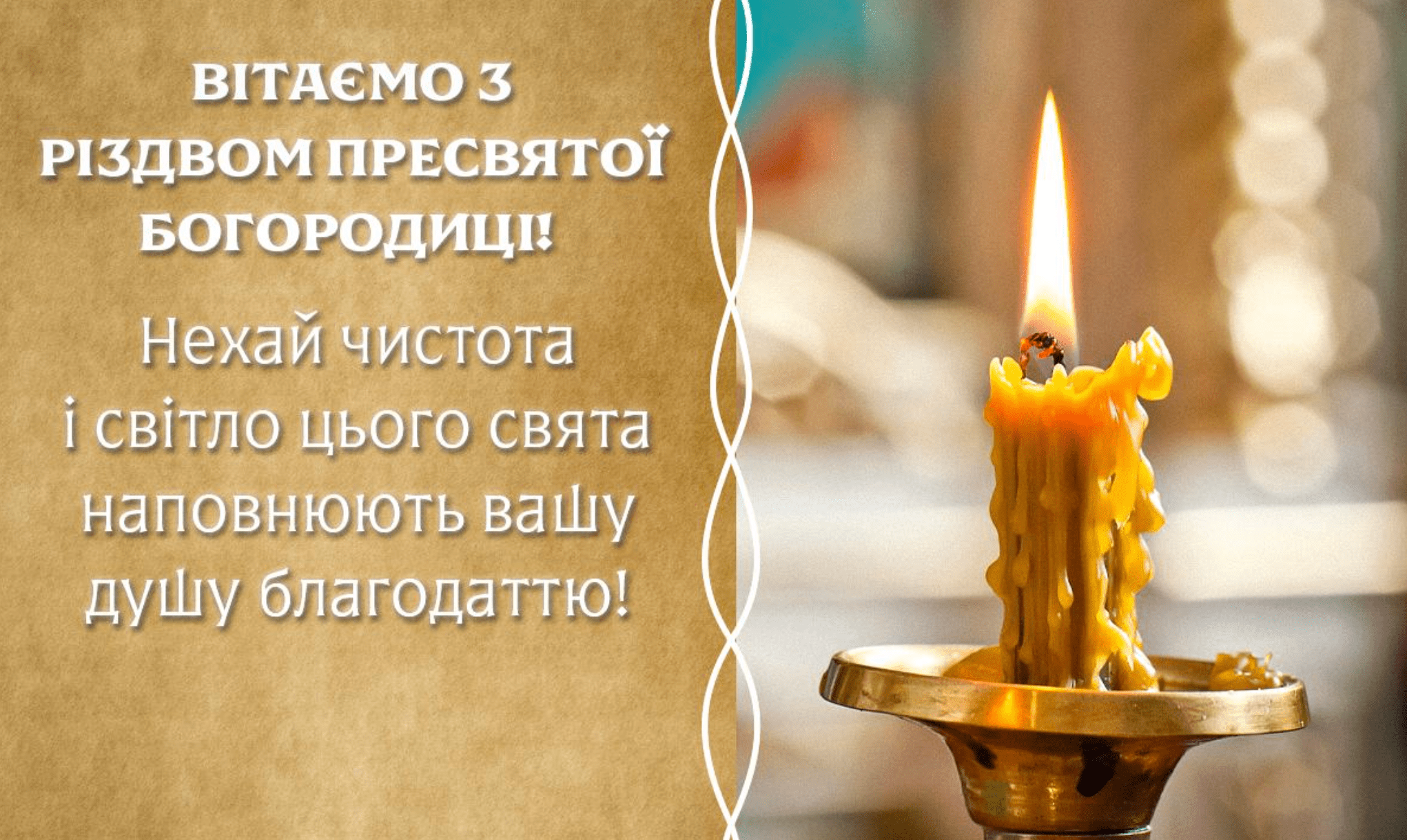 Вітаю з Різдвом Пресвятої Богородиці. Бажаю здоров'я та миру всій родині. Нехай світле світло добра і щастя веде тебе життям, нехай чиста надія і віра живе у твоєму серці, нехай щедра любов Бога і твоїх близьких уберігає тебе від негараздів.