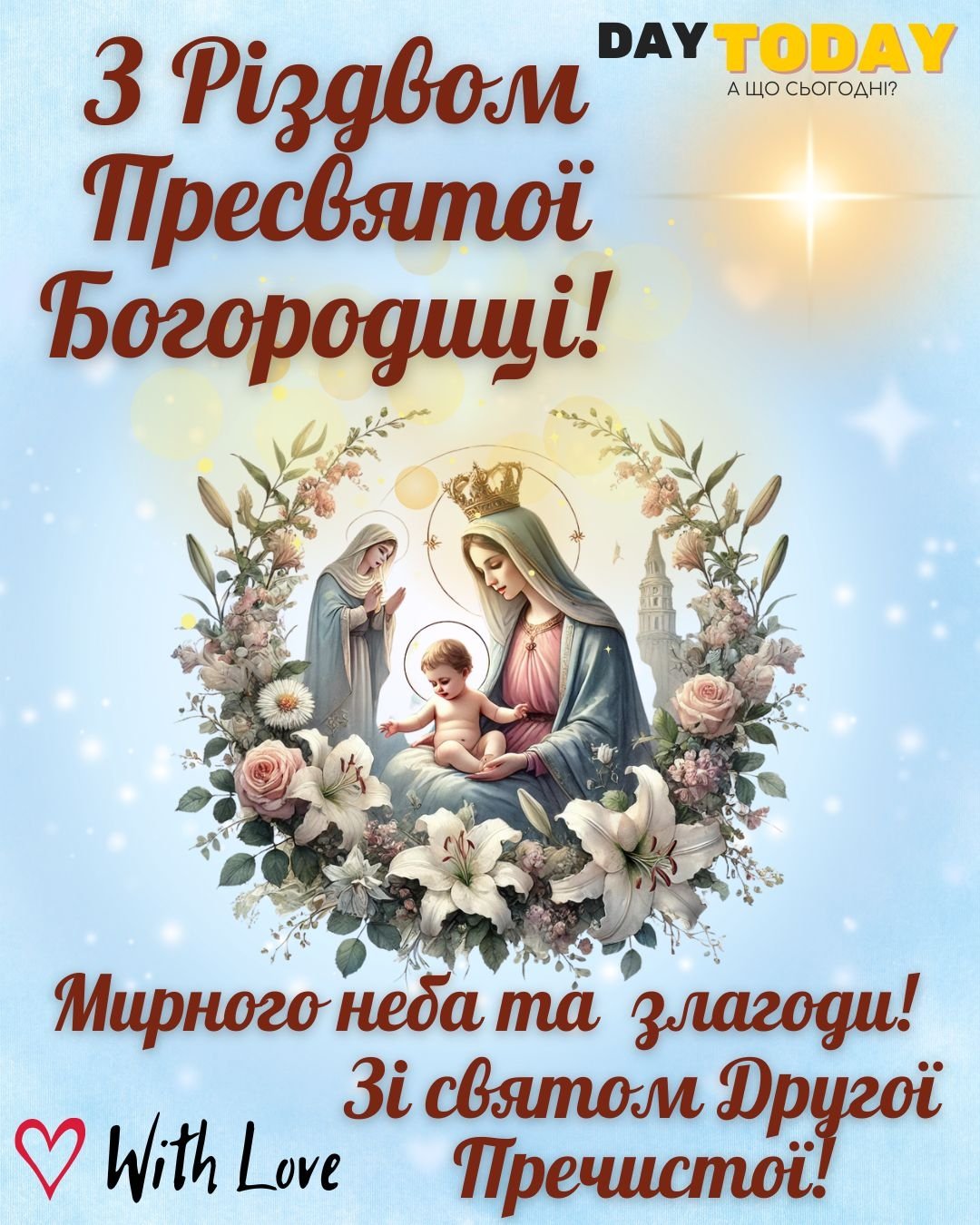 Сердечно вітаю з Різдвом Пресвятої Богородиці! Нехай Божа Матір охороняє сім'ю від лиха і злого духу, дарує щастя і добробут, допомагає приймати правильні рішення і долати труднощі, наповнює душу світлом, любов'ю і милосердям!