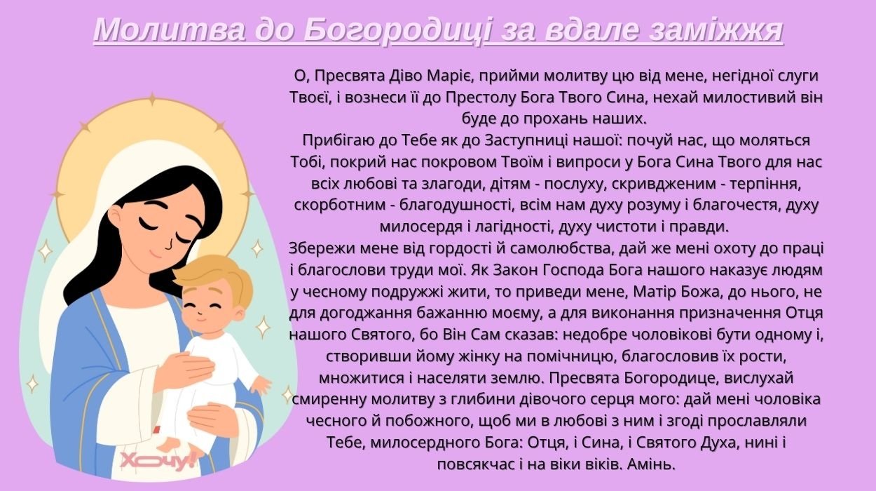 О, Пресвята Діво Маріє, прийми молитву цю від мене, негідної слуги Твоєї, і вознеси її до Престолу Бога Твого Сина, нехай милостивий він буде до прохань наших. Прибігаю до Тебе як до Заступниці нашої: почуй нас, що моляться Тобі, покрий нас покровом Твоїм і випроси у Бога Сина Твого для нас всіх благ: подружжю - любові та злагоди, дітям - послуху, скривдженим - терпіння, скорботним - благодушності, всім нам духу розуму і благочестя, духу милосердя і лагідності, духу чистоти і правди. Збережи мене від гордості й самолюбства, дай же мені охоту до праці і благослови труди мої. Як Закон Господа Бога нашого наказує людям у чесному подружжі жити, то приведи мене, Матір Божа, до нього, не для догоджання бажанню моєму, а для виконання призначення Отця нашого Святого, бо Він Сам сказав: недобре чоловікові бути одному і, створивши йому жінку на помічницю, благословив їх рости, множитися і населяти землю. Пресвята Богородице, вислухай смиренну молитву з глибини дівочого серця мого: дай мені чоловіка чесного й побожного, щоб ми в любові з ним і згоді прославляли Тебе, милосердного Бога: Отця, і Сина, і Святого Духа, нині і повсякчас і на віки віків. Амінь.