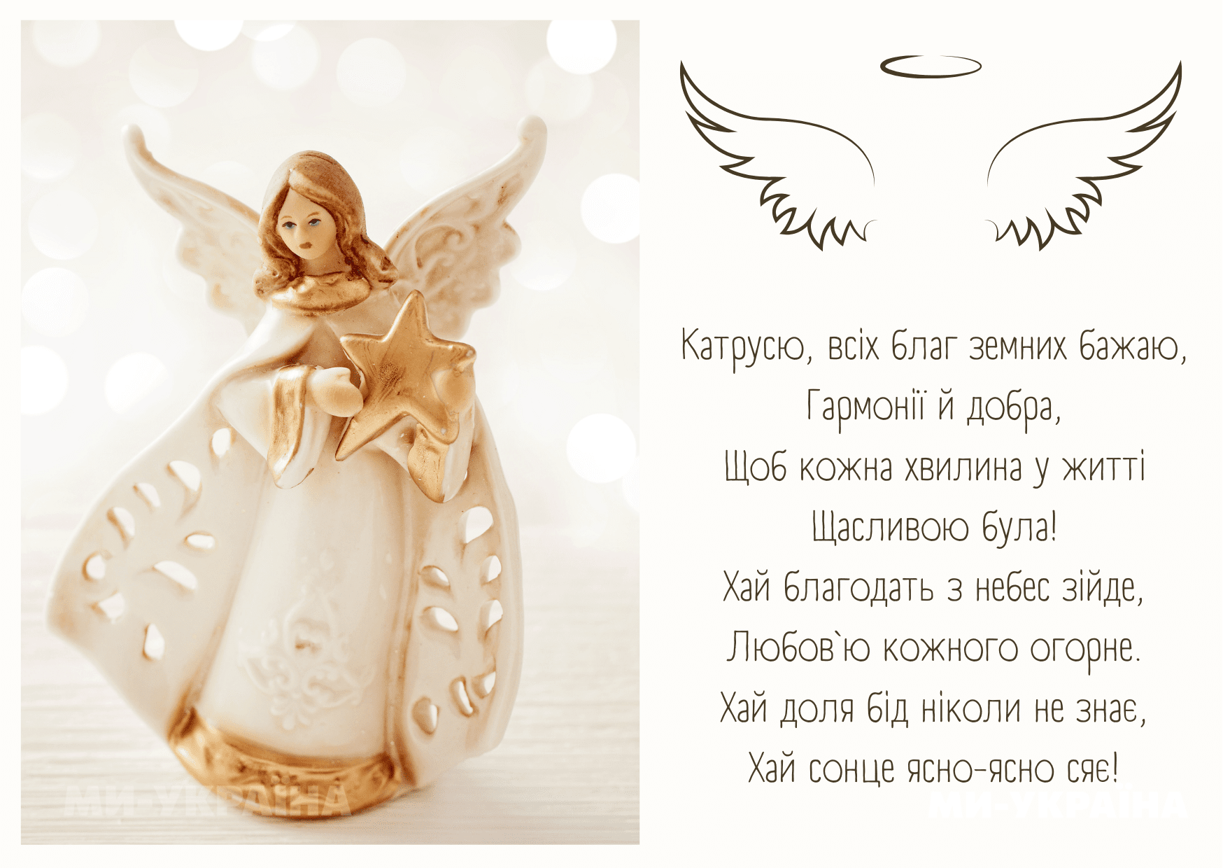 В цей особливий день хочу побажати тобі, Катрусю, щоб твій ангел завжди тебе оберігав і допомагав тобі у всіх твоїх справах – домашніх і робочих, щоб усі твої починання були втілені в життя, а удача тебе супроводжувала всюди! З Днем ангела! 🤍