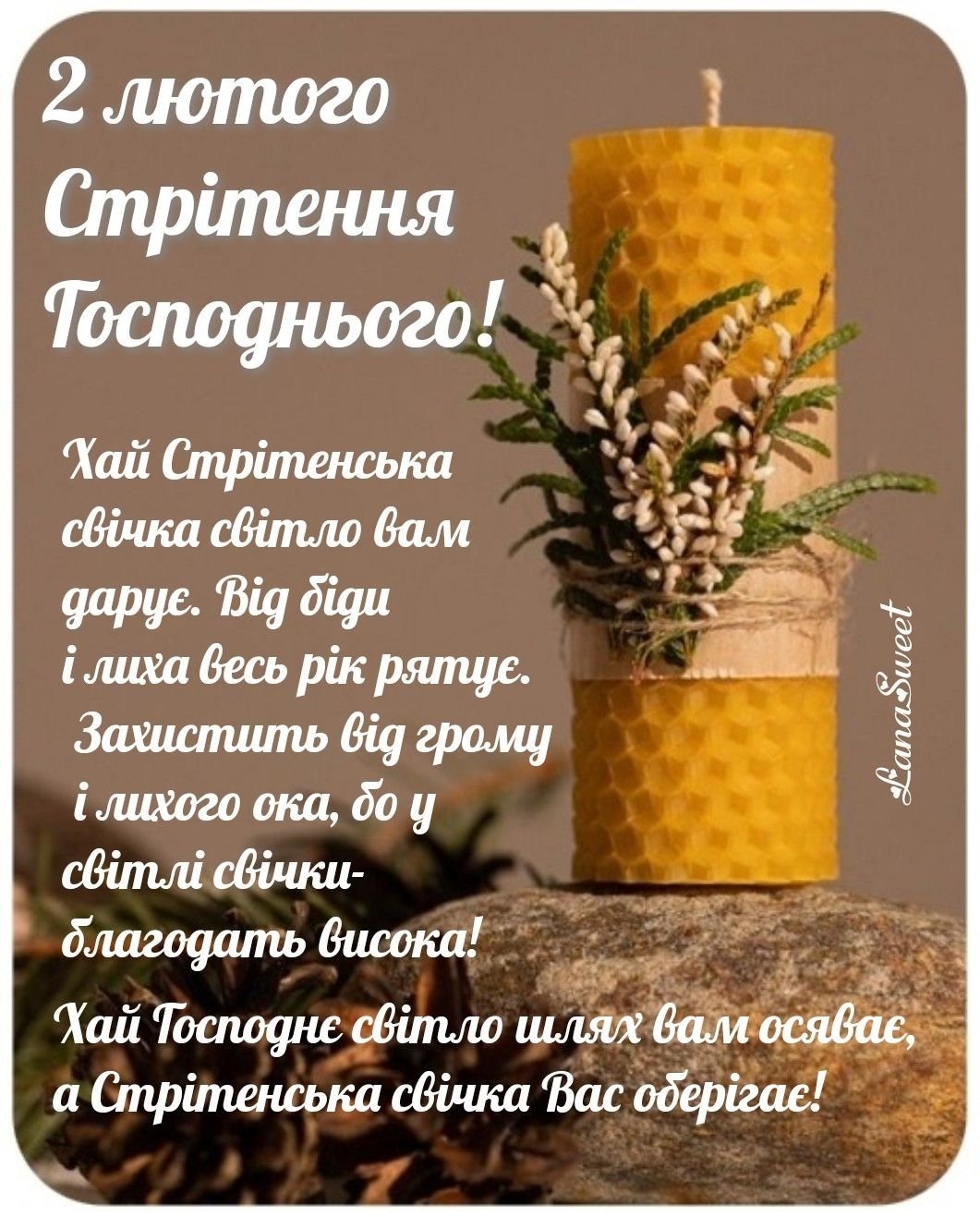 З радістю вітаю зі святом Стрітення Господнього. Нехай цей день для вас буде початком радісного, світлого і чистого життя. Нехай ваш дім наповниться щастям і любов'ю. Зі святом!