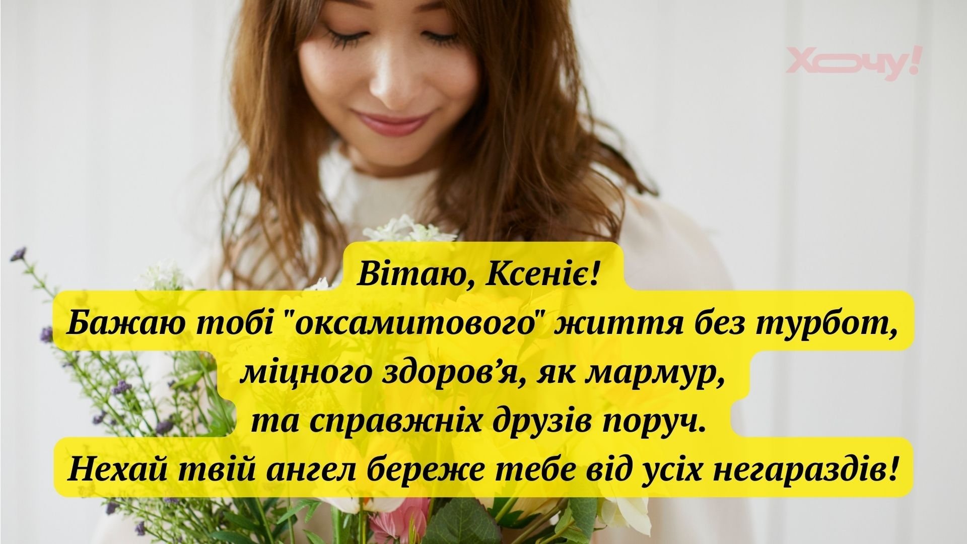 Дорога Ксеніє! Нехай твій ангел-охоронець завжди летить попереду і вказує лише легкий шлях. Бажаю, щоб кожен твій день був схожий на свято — з квітами, щирими усмішками та приємними сюрпризами. Будь щаслива!